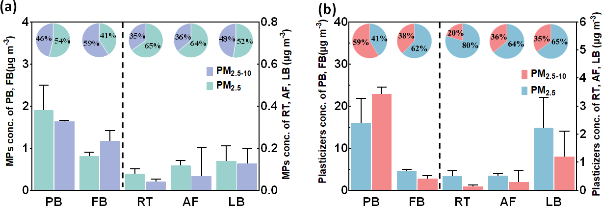 Figure 1Average concentrations of MPs (a) and plasticizers (b) in PM2.5 and PM2.5–10 from five sources (PB: Plastic Burning, FB: Fruit-bag Burning, RT: Road Traffic, AF: Agricultural Film, LB: Livestock Breeding).