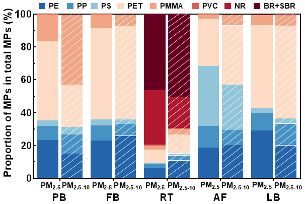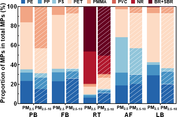 Figure 2Chemical composition of microplastics in PM2.5–10 and PM2.5 from the five sources (PB: Plastic Burning, FB: Fruit-bag Burning, RT: Road Traffic, AF: Agricultural Film, LB: Livestock Breeding).