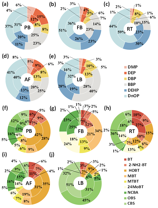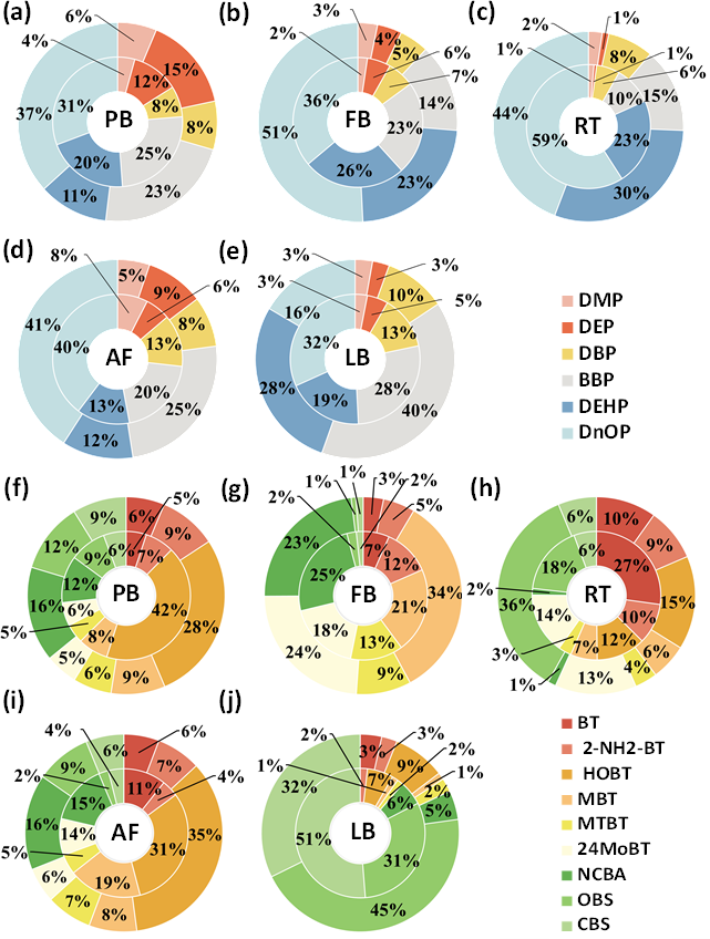 Figure 3Mass proportions of phthalates (PAEs) (a, b, c, d, e) and benzothiazole and its derivatives (BTs) (f, g, h, i, j) in PM2.5–10 (outer ring) and PM2.5 (inner ring) from the five typical sources (PB: Plastic Burning, FB: Fruit-bag Burning, RT: Road Traffic, AF: Agricultural Film, LB: Livestock Breeding).