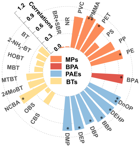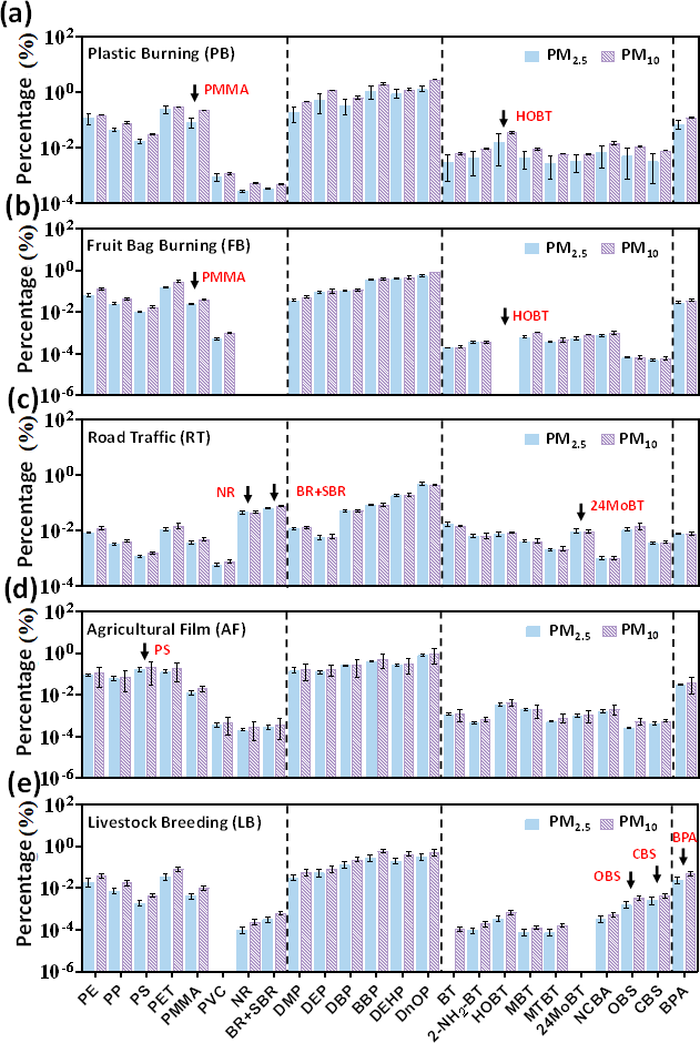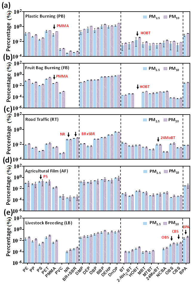 Previous studies have investigated the emission characteristics of plasticizers from various sources. Simoneit et al. (2005) illustrated that the major plasticizers detected in PMs from open burning of plastics were dibutyl phthalate (DBP), diethylhexyl adipate (DEHA), and diethylhexyl phthalate (DEHP). Zeng et al. (2020) reported that phthalate concentrations in greenhouse air were higher than those in ambient air. Liu et al. (2023) found that phthalates were the most dominant plasticizer components in tunnel PM2.5, accounting for 64.8 % of the detected plasticizers. Zhang et al. (2018) demonstrated that tire material-related compounds, benzothiazole (BT), and 2-hydroxybenzothiazole (2-OH-BT) were the major compounds in both tire and road dust samples. The majority of existing studies on atmospheric MPs and plasticizers have focused on analyzing the emission characteristics of individual sources and have lacked a comprehensive and comparative analysis of the MP emission profiles of various sources.