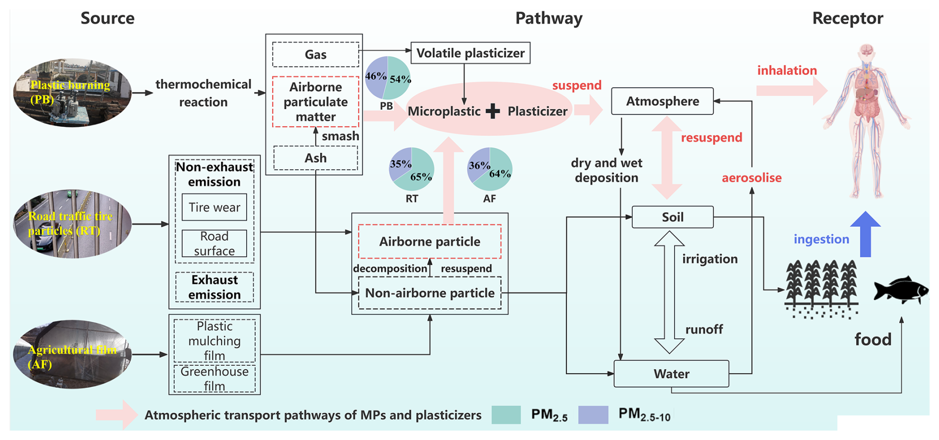 As shown in Fig. 5, plastic combustion emitted MPs and attached plasticizers into the ambient air (Velis and Cook, 2021); the residual in the bottom ash can break into MPs via wind abrasion, then be re-suspended in the air or deposited onto surrounding soil or into water with a risk of entering the food chain (Yang et al., 2021; Velis and Cook, 2021; Pathak et al., 2024). Small microplastics (micro-rubber) from Road Traffic are emitted as airborne fine particles or trapped in the road surface, from where they can enter the water by surface runoff, migrating and transforming across different environmental media (Kole et al., 2017). Under ultraviolet degradation and wind erosion, agricultural films can release MPs and plasticizers into the air directly, while larger particles are deposited in farmland (Song et al., 2017). Disturbed by agricultural activities and wind, MPs created by residual films in the soil may be re-suspended in the air (Brahney et al., 2021; Jin et al., 2022). These pathways are all possible routes for MPs to enter the human body, and controlling these pathways can reduce exposure levels.