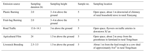 During January and February 2024, PM2.5 and PM10 samples were collected simultaneously from five distinct sources in three key cities of the Guanzhong Plain: Xi'an, Tongchuan, and Xianyang (Fig. S1 in the Supplement). The selected sources included Plastic Burning, Fruit-bag Burning, Road Traffic, Agricultural Film, and Livestock Breeding. It should be noted that plastics from the Plastic Burning source, including plastic bags, bottles, disposable tableware, foam boxes, and other plastic daily necessities, are incinerated. Fruit bags are typically lightweight thin films, which are designed for single use and are often discarded after a short period, differing from common household plastic waste. These bags are usually made from low-density polyethylene and nylon, which are known for their flexibility and transparency (Ali et al., 2021; Yang et al., 2022). The Guanzhong Plain is an important fruit production base in China, with the highest consumption of fruit bags. Local residents often use the above-mentioned plastic products to ignite solid fuels for indoor heating or cooking. The reason we distinguish between Plastic Burning and Fruit-bag Burning rather than classifying them as a single combustion source is that the wax layer in fruit bags cannot be separated from the plastic. This is a distinctive source in the Guanzhong region (this is also quite common in fruit-producing areas in northern China), and local residents typically burn fruit bags directly without separating the wax. Table 1 provides a summary of the essential details for each source.