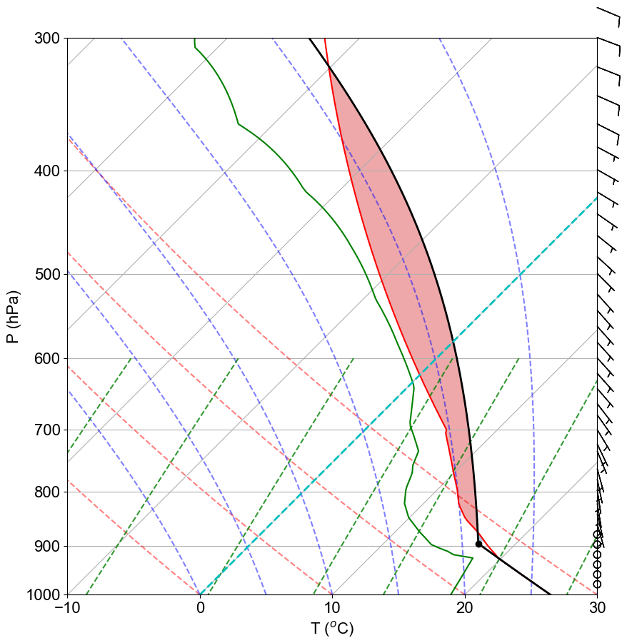 Figure 1Vertical profile of atmospheric variables in a skew T-log P diagram including temperature (red) and dew point temperature (green) profiles as well as the CAPE (red shaded area) and lifting condensation level (LCL, black dot). Conditions correspond to a CAPE of 763.7 J kg−1 and an equilibrium level (EL) of 318.9 hPa and −30.2 °C.