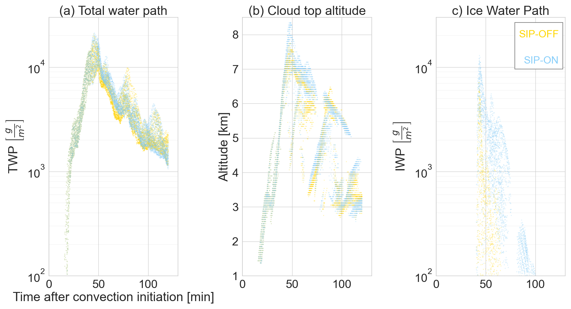 Despite these commonalities between simulation scenarios, once the deep convective core had risen above freezing level, SIP processes caused noticeable changes in cloud geometry, phase structure and microphysics, particularly at the mixed-phase cloud section. Figure 2 depicts the total water path (TWP), cloud top altitude and ice water path (IWP) in the deep convective core (i.e. model columns with the highest TWP values) and reflect the pulsating growth habit that is characteristic of cumulus clouds. During the convective initiation stage, cloud tower conditions in the SIP-ON scenario corresponded to higher total water contents (Fig. 2a) and higher altitudes (Fig. 2b) with the cloud phase shifted towards ice due to higher ice water content values (Fig.2c). Peaks in TWP are indicative of convection intensity and can be characterized by its occurrence time and duration. The SIP-ON scenario showed taller and wider peaks suggesting a slower weakening of the convection intensity along the simulation compared to the SIP-OFF scenario. 50 min after convection initiation, there was a reduction in TWP values due to surface precipitation. It was noticeable that the SIP-OFF scenario did not produce as much ice as the SIP-ON scenario after 60 min.