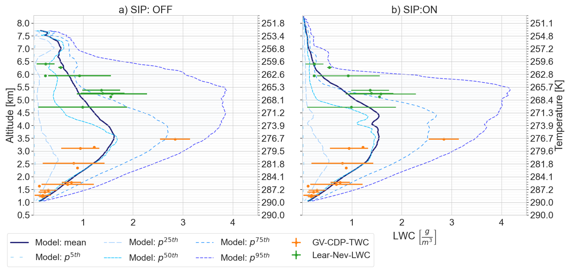 Figure 3Vertical profile of liquid water content in updrafts with cloudy conditions. The variability in model outputs is depicted using the mean and main percentiles values while observations are shown as the mean ± standard deviation for measurements with the Fast Cloud Droplet Probe in the GV-flight (GV-CDP) and with the SkyPhysTech Nevzorov Probe in the Lear35 flight (Lear-Nev). (a) Simulation scenario without secondary ice processes. (b) Simulation scenario with secondary ice processes including rime splintering (RS), droplet shattering (DS) and ice–ice collisional breakup (IIBR).