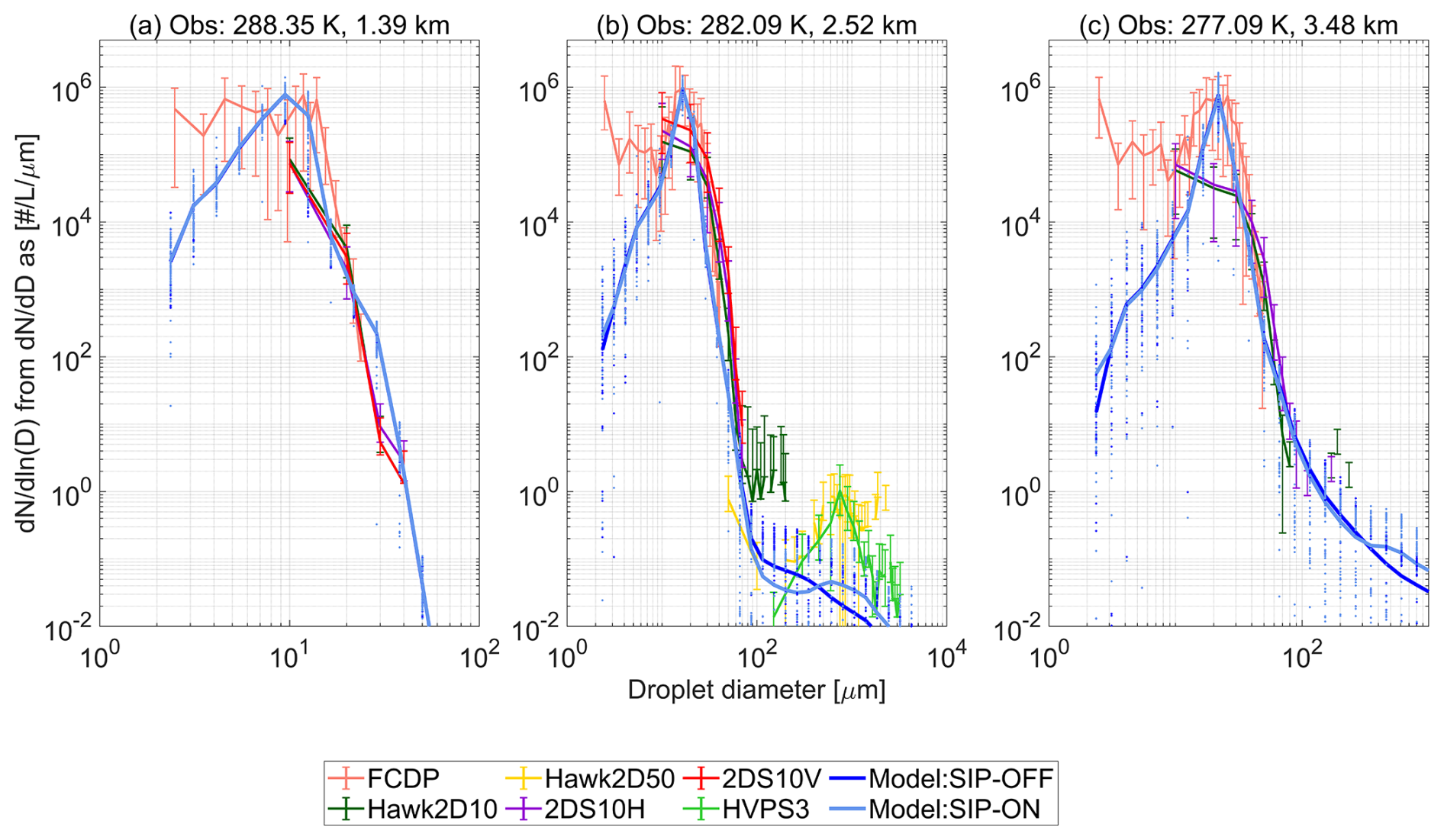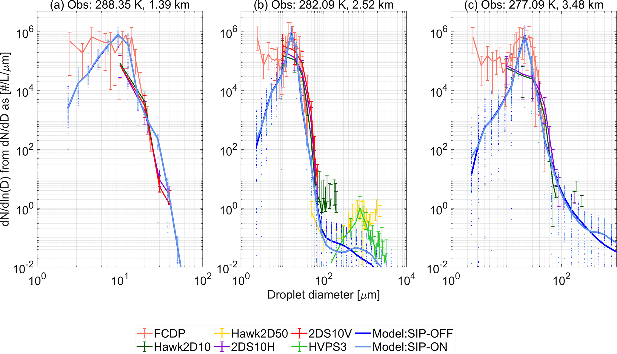 Figure 4Droplet size distributions in updrafts at the following altitudes (a) cloud base, (b) 1 km above cloud base, (c) 500 m below freezing level. Observations are shown as mean values with error bars going from the 50th to the 99th percentile and labeled according to the nomenclature described in Table S1. Modeled values are shown as mean horizontal values with dotted lines along size bins indicating variability across cloudy points with LWC > 0.01 g m−3 and updraft velocity > 0.02 m s−1.