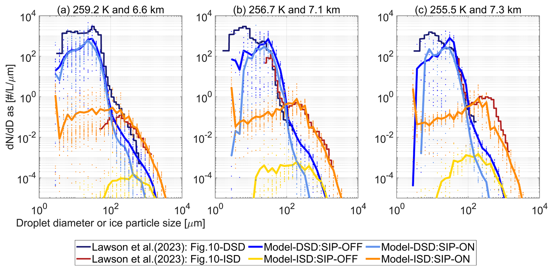 Figure 5Ice particle size distributions in updrafts at altitudes of (a) 2.6 km above freezing level (b) 3.2 km above freezing level (c) 400 m below cloud top. Observations were taken from Fig. 10 in Lawson et al. (2023b). Modeled values are shown as mean horizontal values with dotted lines along size bins indicating variability across cloudy points with mixed-phase conditions defined as LWC > 0.01 g m−3, IWC > 0.001 g m−3 and updraft velocity > 0.02 m s−1.