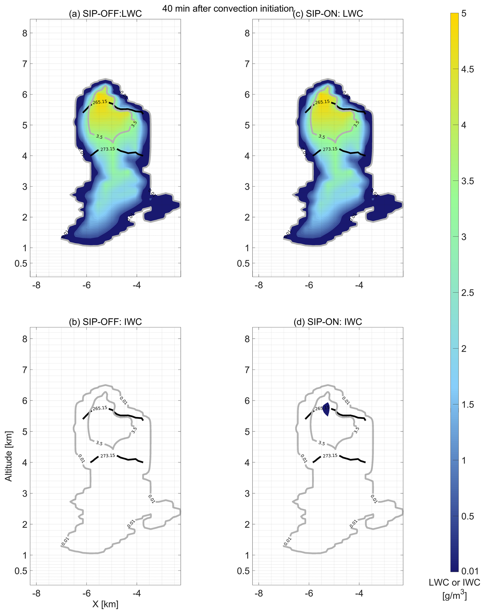 Figure 6Vertical profile of liquid water content (LWC) and ice water content (IWC) at 40 min after convection initiation. Contour lines in gray indicate Total Water Content (TWC) values of 0.01 and 3.5 g m−3 to enclose cloudy and core conditions. Continuous black lines indicate altitudes at which temperatures are 273.15 and 265.15 K corresponding to freezing and maximum ice multiplication by rime splintering, respectively. (a–b) Simulation scenario without secondary ice processes. (c–d) Simulation scenario with secondary ice processes.