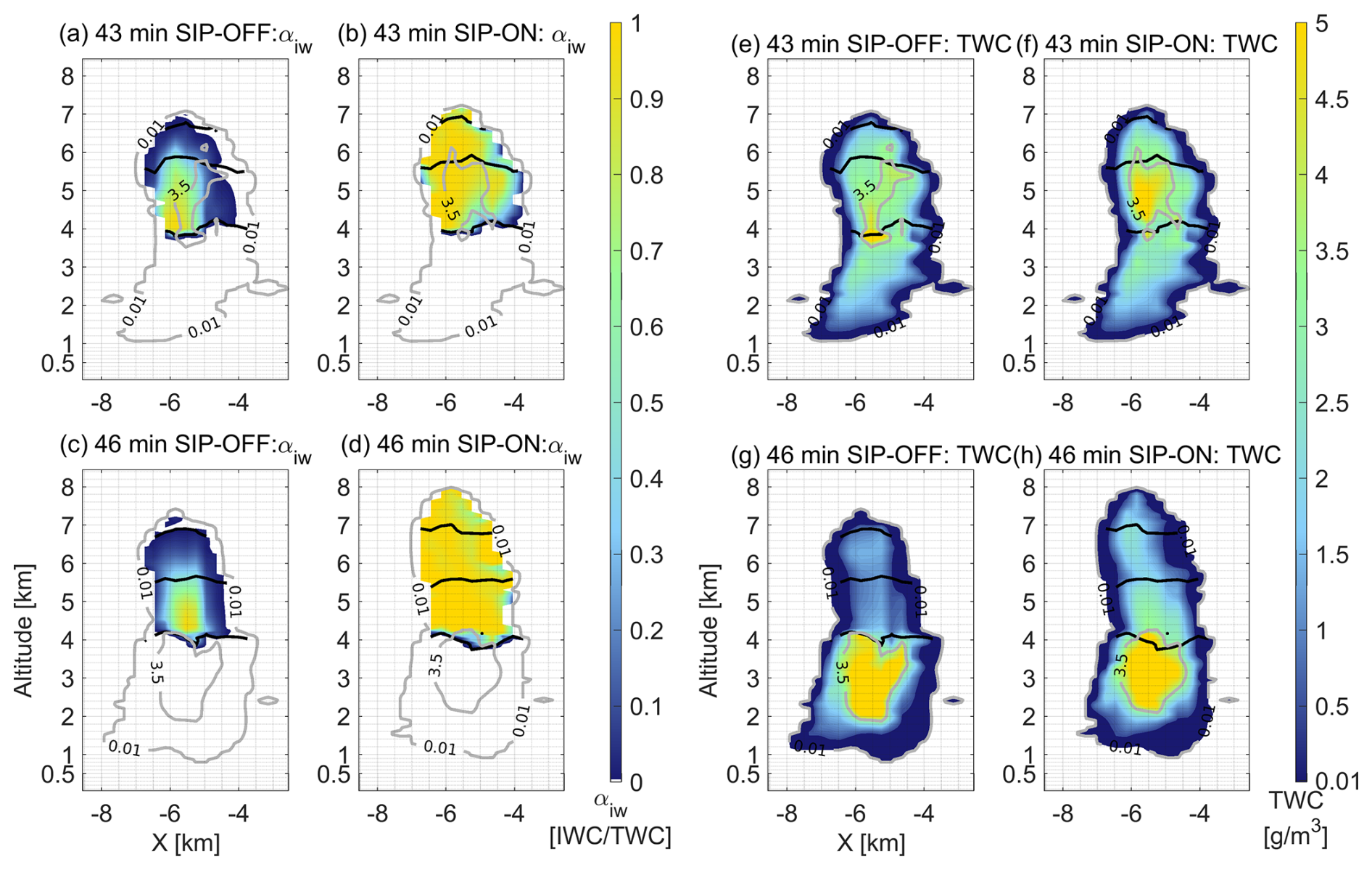 We have chosen the time instances of 40, 43 and 46 min to follow the changes in the vertical profiles of LWC and IWC in correlation with changes in the vertical wind and SIP rates. Figure 6a, c compares liquid water contents at 40 min after convection initiation indicating larger values above freezing level for the SIP-ON scenario (i.e. wider area with TWC > 3.5 g m−3). It was at this time instance when IWC values overpass the threshold (i.e. IWC > 0.001 g m−3) even the cloud top had reached freezing conditions 5 min earlier. Areas containing ice are depicted in Fig. 6b, d. Rates of secondary ice production were observed at the top of the cloud turret with effects over larger areas and higher rates for the mechanism of droplet shattering compared to the rime splintering as shown in Fig. 7.