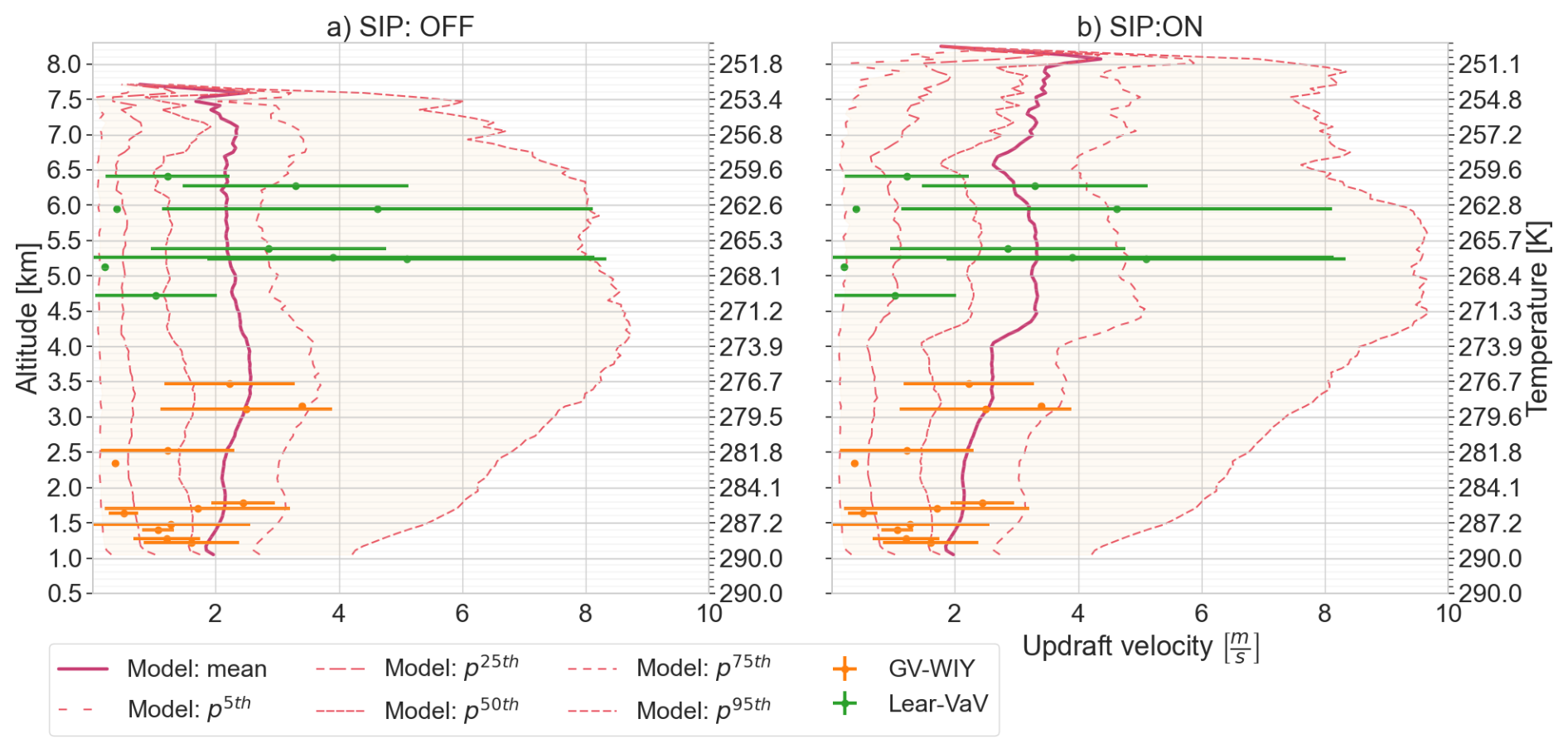 Figure 9Vertical profile of updrafts in cloudy conditions. The variability in model outputs is depicted using the mean and main percentiles values while observations are shown as the mean ± standard deviation for measurements with the Aircraft-Integrated Meteorological Measurement System (AIMM-20) GV-WIY in the GV flight and Lear-VaV in the Lear35 flight. (a) Simulation scenario without secondary ice processes. (b) Simulation scenario with secondary ice processes.