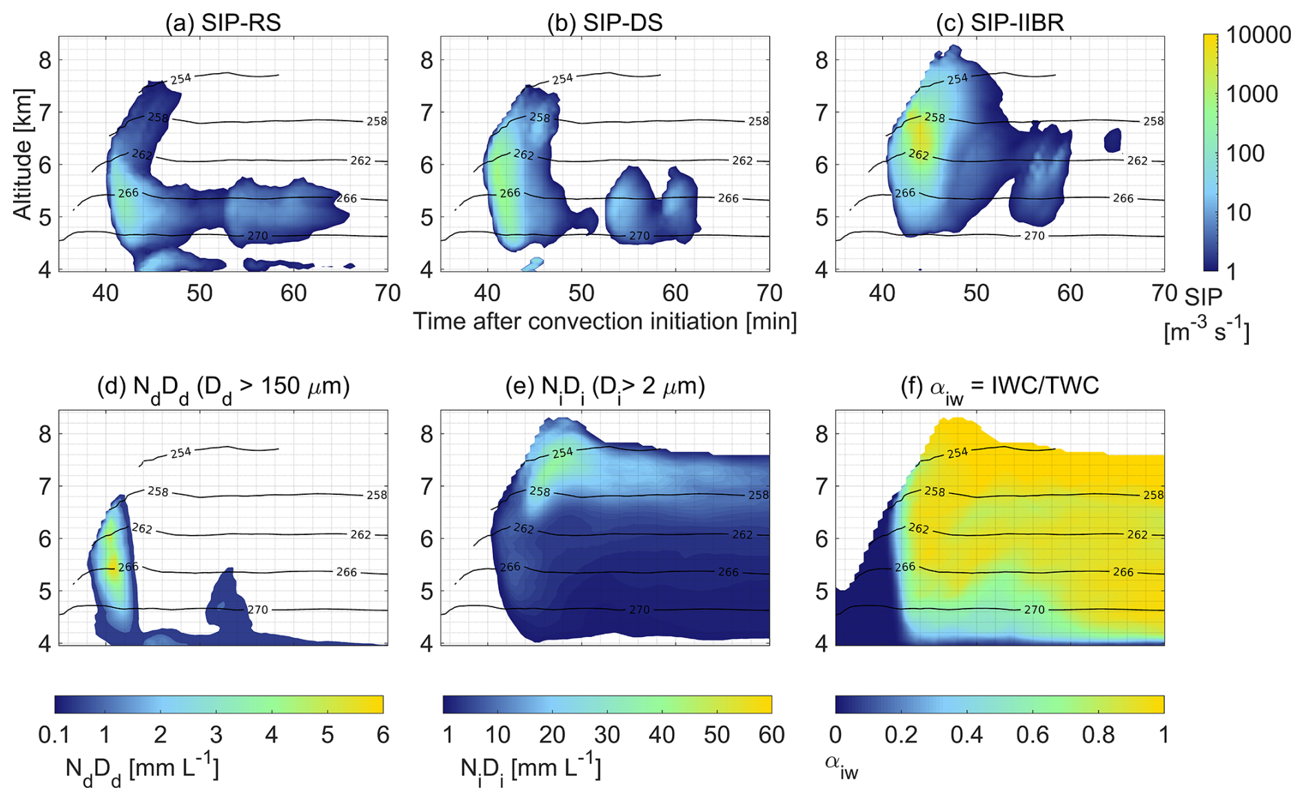 Keeping the analogy between a chemical reaction and a secondary ice production event as collision-driven processes, we included the rates of secondary ice production per mechanism to quantify the process velocity and duration in Fig. 11a–c. In Fig. 11d–e, we included the integral diameter or first moment of the size distributions for rain droplets (i.e. for droplets with sizes between 150 µm and 2 cm) and ice particles to quantify the effective presence of reagents and products. The progress of glaciation was followed using the cloud phase partitioning factor αiw (i.e. ratio between IWC and TWC) in Fig. 11f. We included a contour plot to account for temperature effects included in the parameterization of ice multiplication factors (IMF).