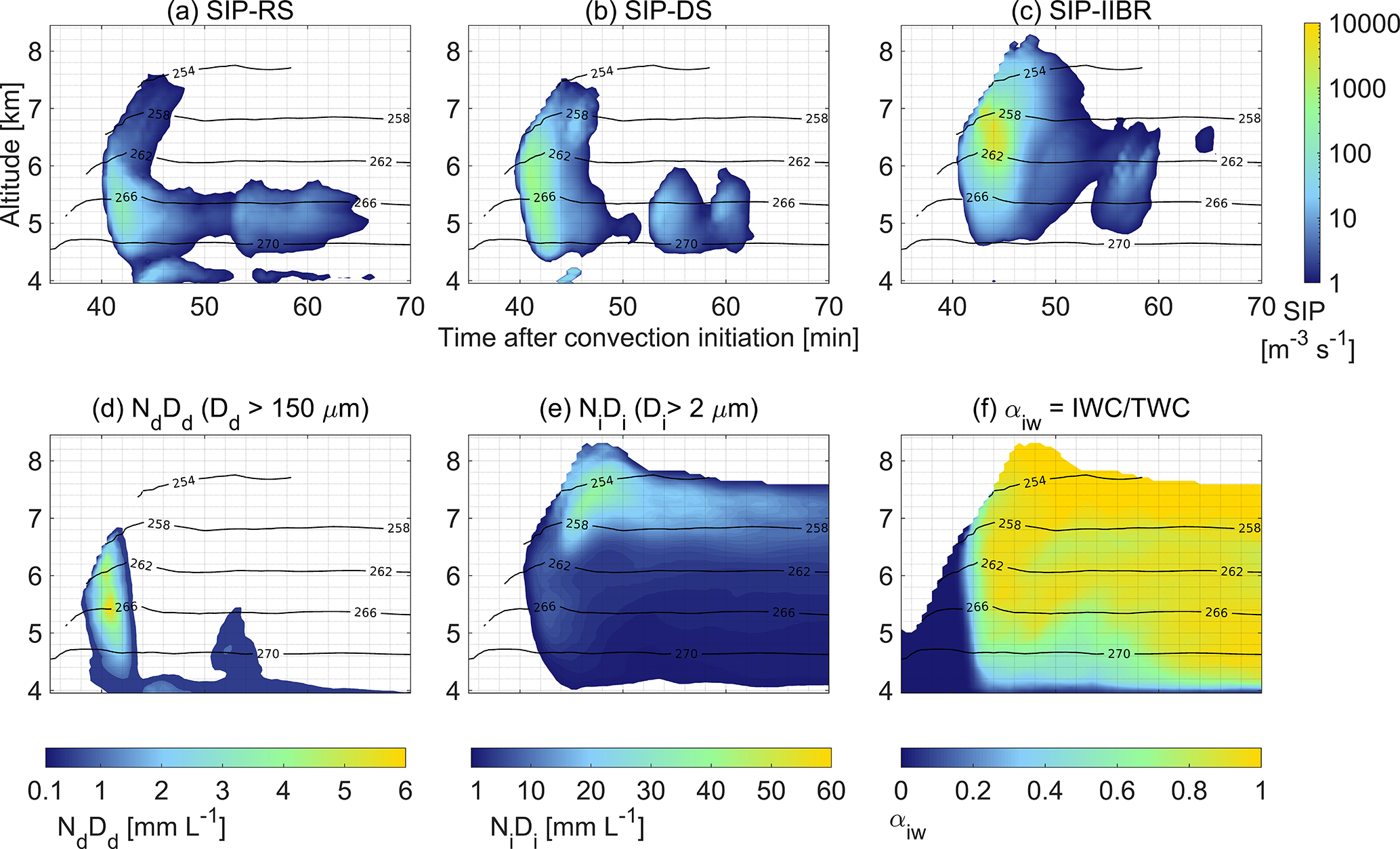 The glaciation started at 40 min after convection initiation with minimal presence of ice particles in the average cloud field due to INP-limited primary ice formation. At this time instance, secondary ice production by droplet shattering (SIP–DS) was the only one active with rates above 5 at altitudes between 5.6 and 6.1 km with temperatures varying between 262 and 265 K as shown in Fig. 11b. Higher rates of SIP–DS were reached when the integral diameter of rain droplets was above 3.5 mmL−1.
