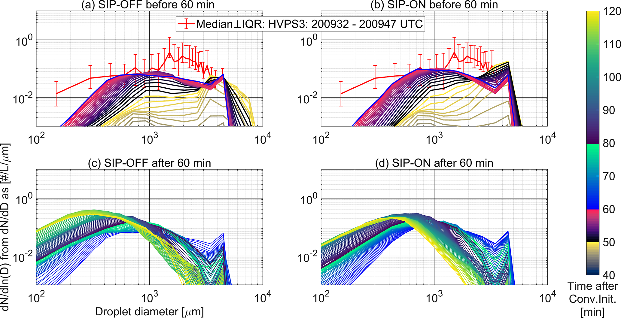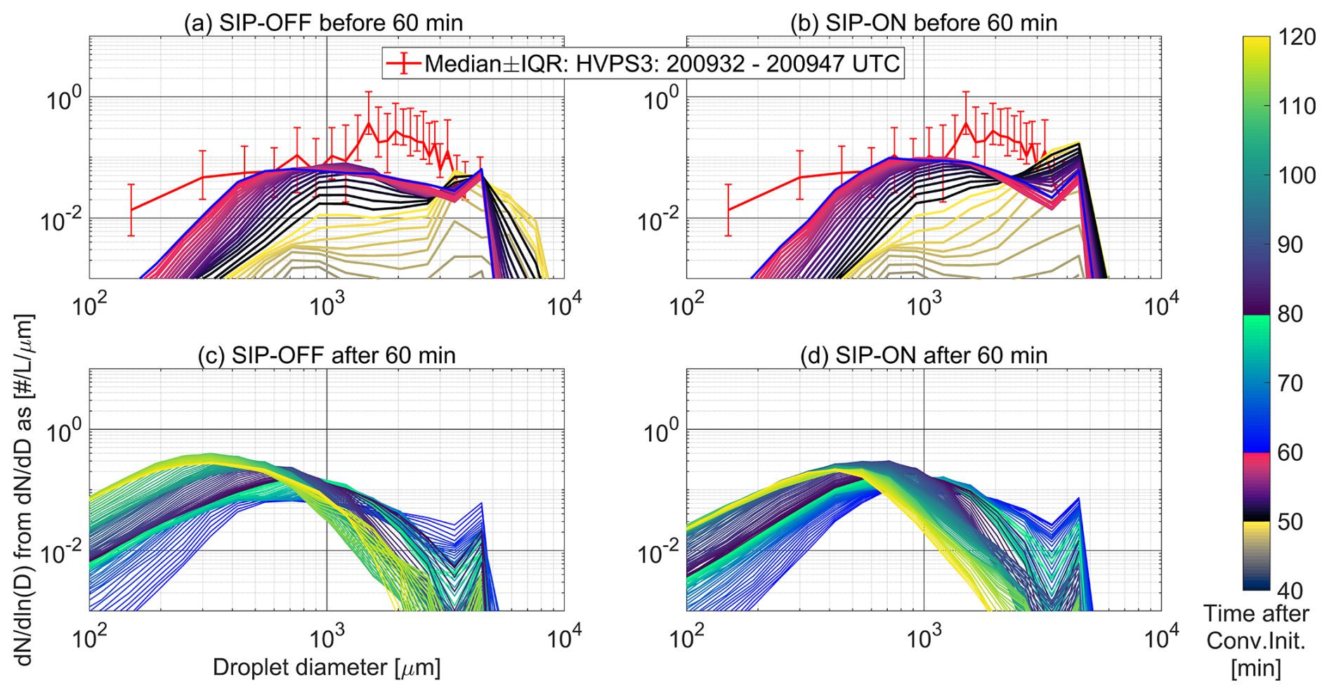 Figure 12Temporal variation of droplet size distributions below cloud base at an altitude of 1.05 km compared to droplet size distributions derived from the High Volume Precipitation Spectrometer (HVPS3) measured at 1.03 km. Modeled outputs were represented using average size distributions in cloudy points. Distributions are color coded to follow the simulation time after convection initiation. (a) SIP-OFF scenario in the first simulation hour. (b) SIP-ON scenario in the first simulation hour. (c) SIP-OFF scenario in the second simulation hour. (d) SIP-ON scenario in the second simulation hour.