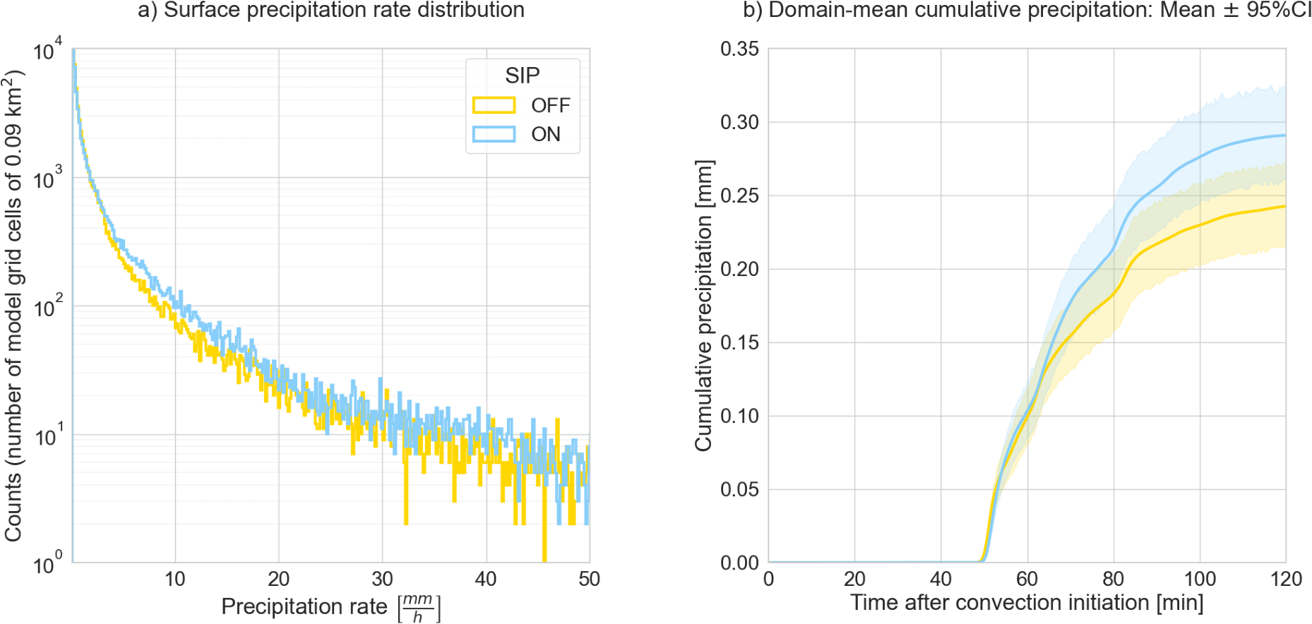 Surface precipitation rates in the SIP-ON scenario showed increases in the probability of occurrence at values below 20 mm h−1 due to increases in the number concentration of millimeter-sized droplets. Changes in the surface precipitation rates in the early phase occurring shortly after SIP events were minimal but increased with the enhancement in accretion rates (i.e. more numerous large ice particles produced more raindrops below the melting layer) causing an increase in the domain-mean cumulative precipitation in the SIP-ON scenario.