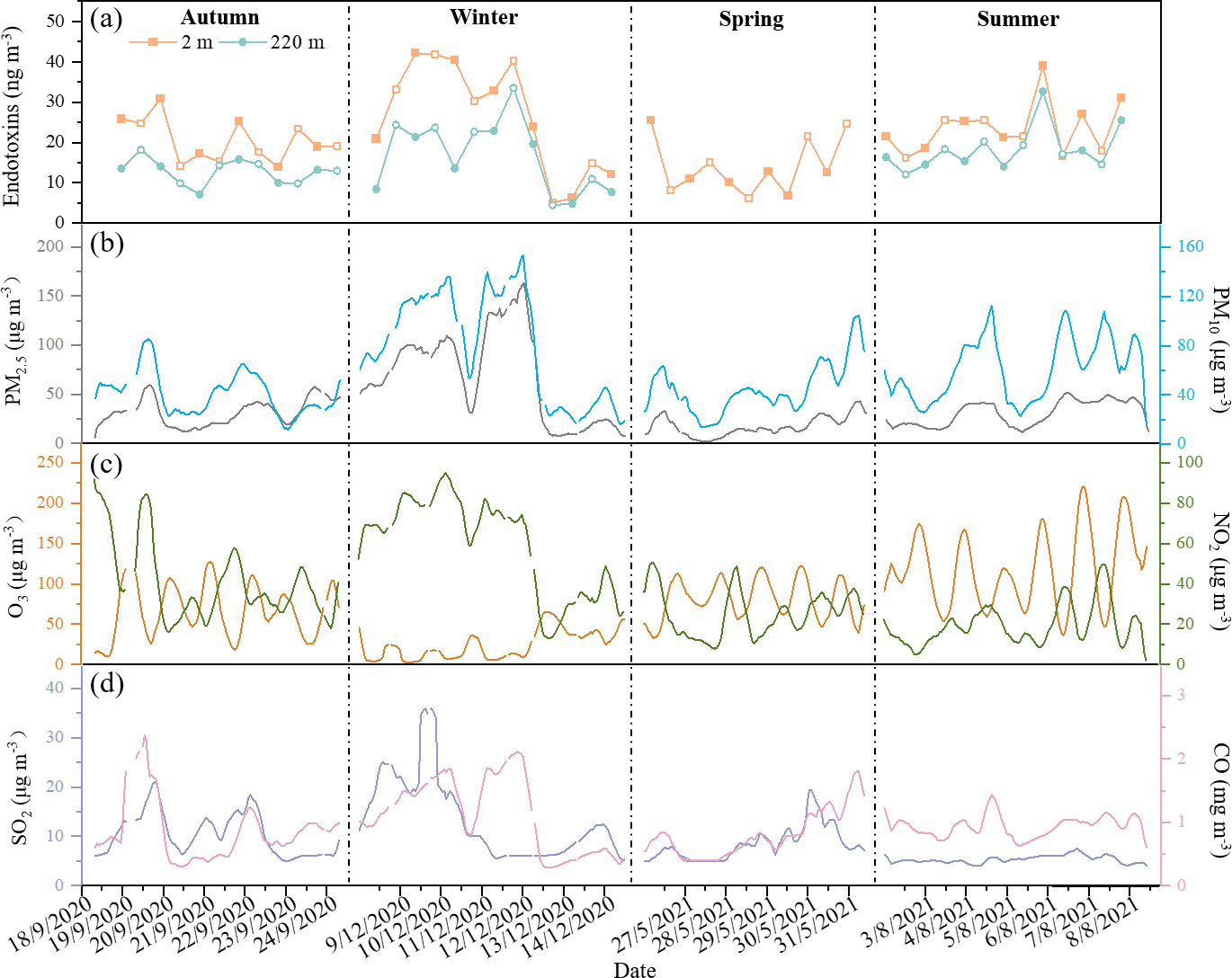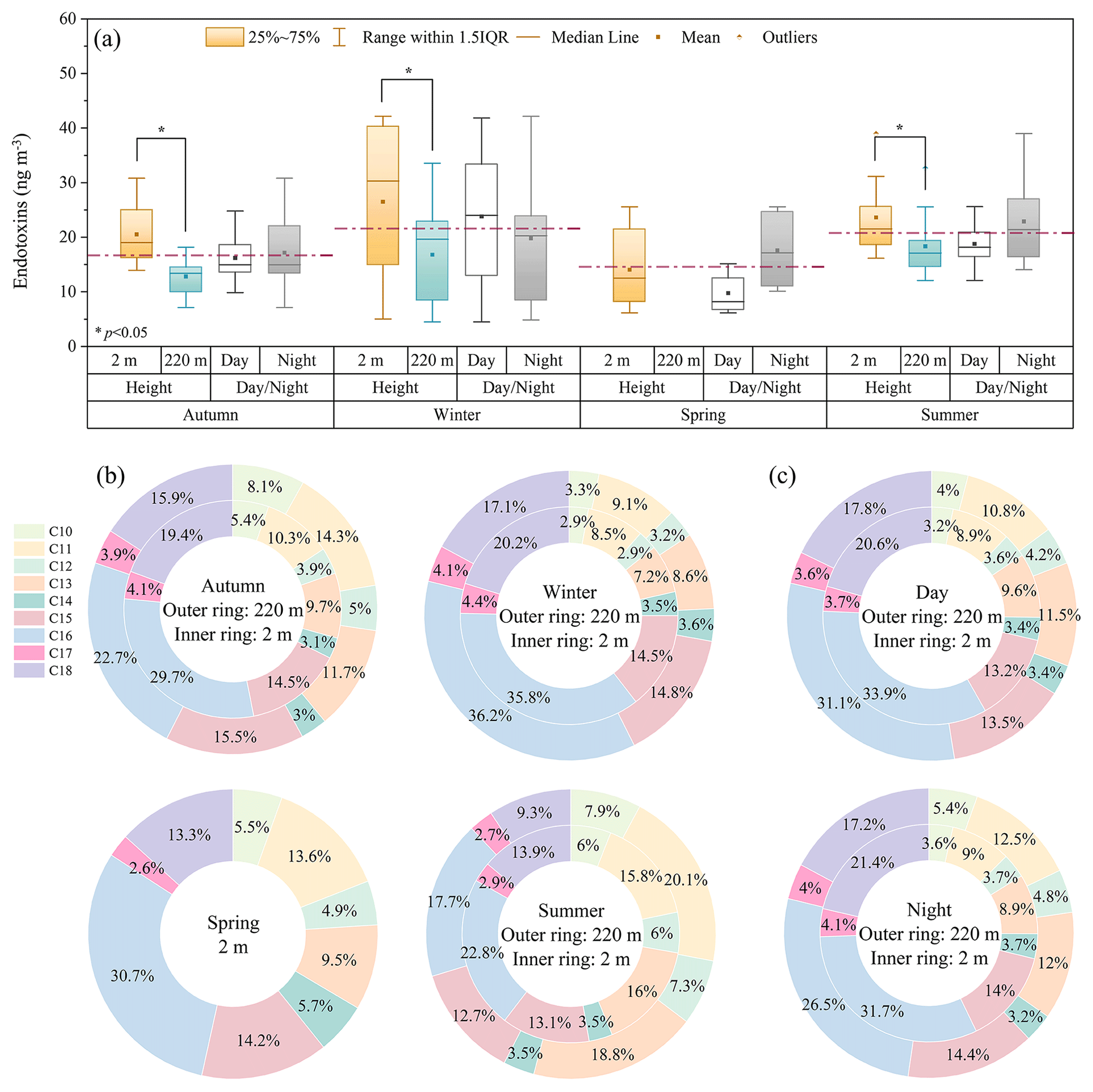 Previous studies on endotoxins have primarily focused on occupational exposure and the health effects of excessive endotoxin exposure (Liebers et al., 2006; Amin et al., 2023). However, research on endotoxin levels in the ambient atmosphere remains limited. The vertical distribution, spatiotemporal patterns of airborne endotoxins in the urban boundary layer, and their possible influencing factors have yet to be reported.