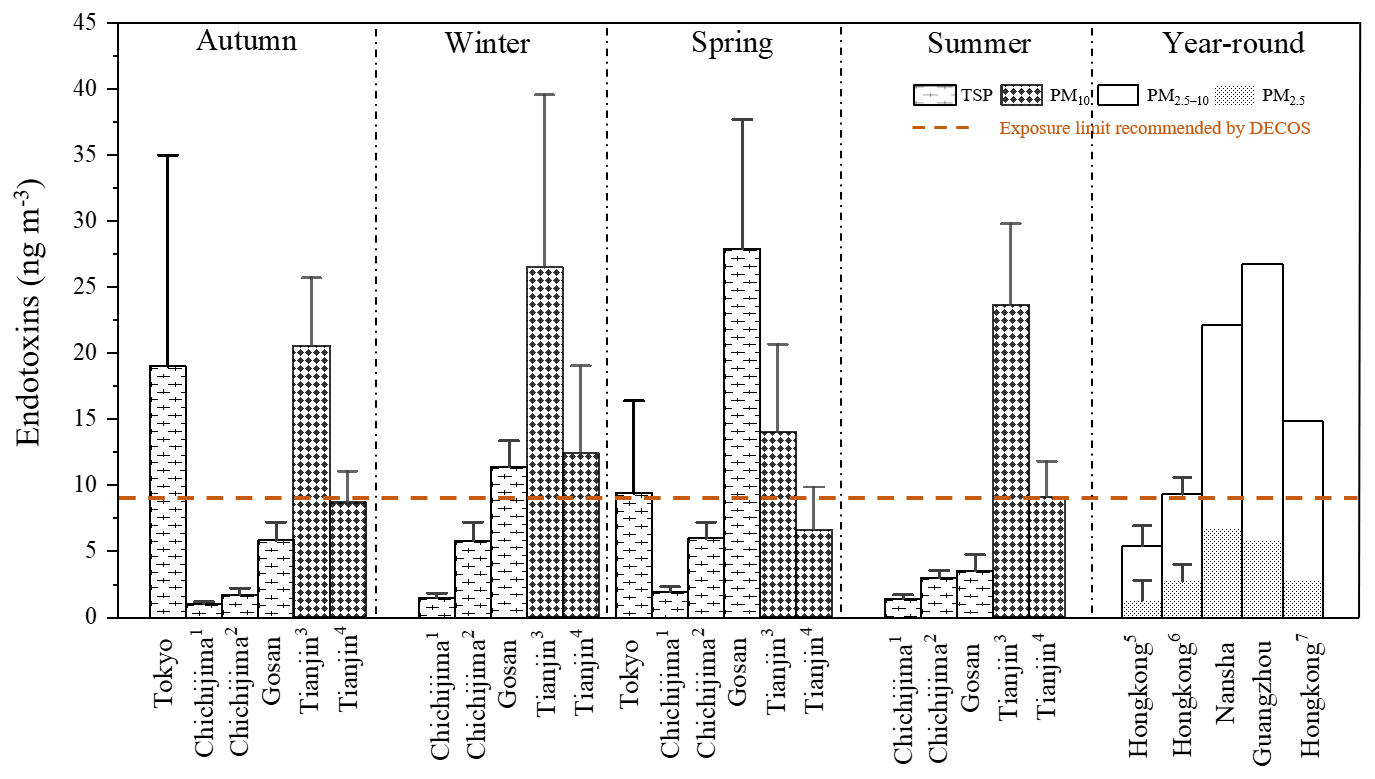 Different from higher endotoxin levels observed in winter and summer in Tianjin, the endotoxin level was much higher in spring at Gosan, Korea, which was probably due to the enhanced mobilization of mineral dust through high altitudinal long-range atmospheric transport (Tyagi et al., 2017). Dutch Expert Committee on Occupational Safety (DECOS), a Committee of the Health Council of the Netherlands stated that exposure to endotoxin above 9 ng m−3 for 8 h or more increases the risk of respiratory diseases (DECOS, 2010). The endotoxin concentrations reported in this study and in previous studies exceeded this value, except for remote islands such as Chichijima (Fig. 5), raising an environmental health issue caused by airborne endotoxins.