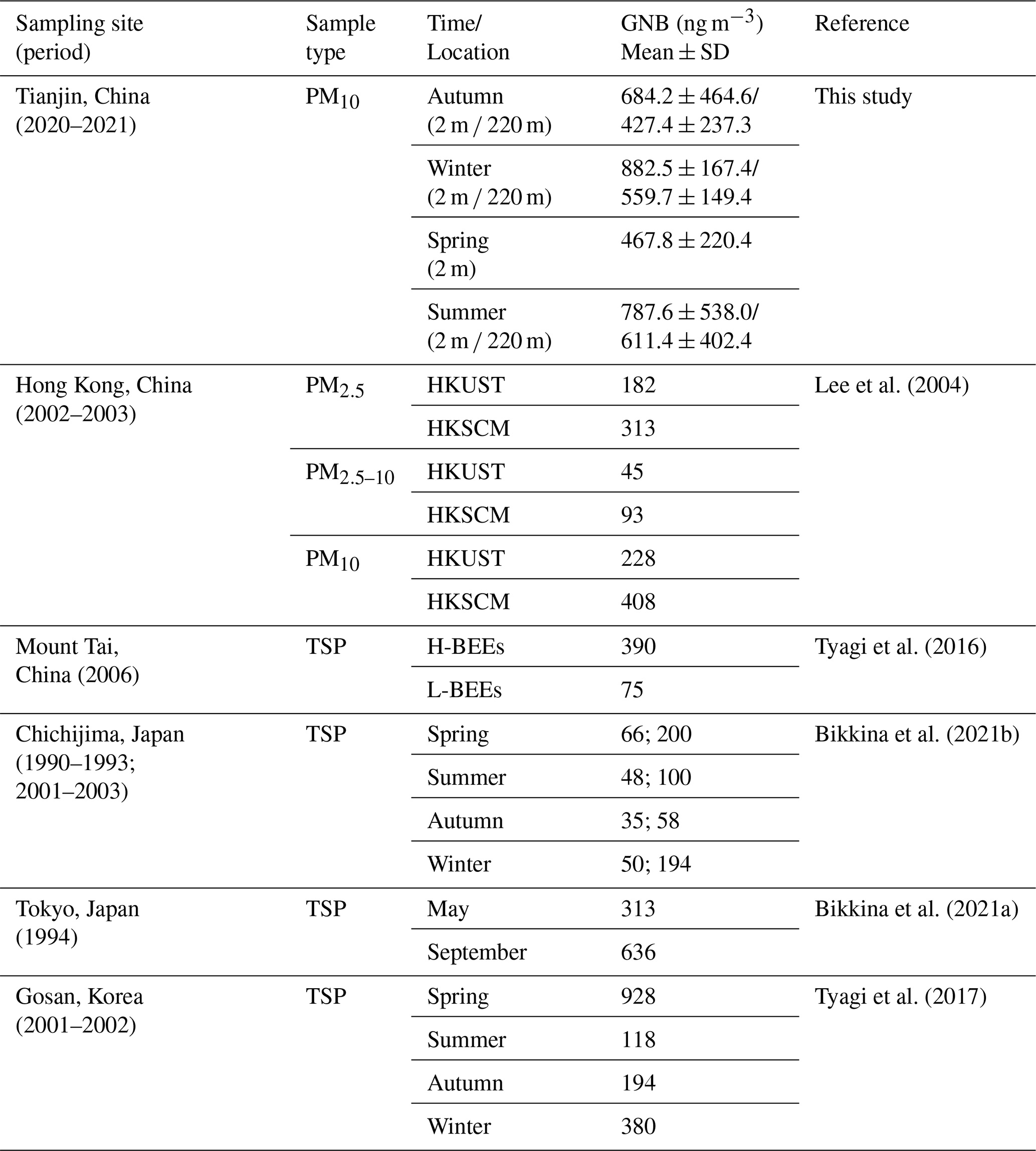 Based on the empirical equations, the dry mass loading of airborne GNB was estimated from the endotoxin mass concentration. The mass concentrations of airborne GNB measured in this study and previous literatures measured in urban, marine and alpine aerosols are listed in Table 2. The dry mass concentration of airborne GNB showed obvious regional variations. The airborne GNB dry mass concentration in Tianjin was the highest in winter (882.5 ± 167.4 ng m−3), followed by summer (787.6 ± 538.0 ng m−3), autumn (684.2 ± 464.6 ng m−3), and the lowest in spring (467.8 ± 220.4 ng m−3) at 2 m. Dry-mass concentrations of GNB in Tianjin PM10 are markedly higher than those reported for PM10 from Hong Kong in 2002–2003 (Lee et al., 2004) and even exceed GNB levels measured in TSP at Chichijima (Japan) (Bikkina et al., 2021b), Tokyo (Japan) (Bikkina et al., 2021a), and Gosan (Korea) (Tyagi et al., 2017). These findings underscore the exceptionally heavy bioaerosol burden in urban Tianjin and highlight the urgency of mitigating biological, as well as chemical, particulate pollution.