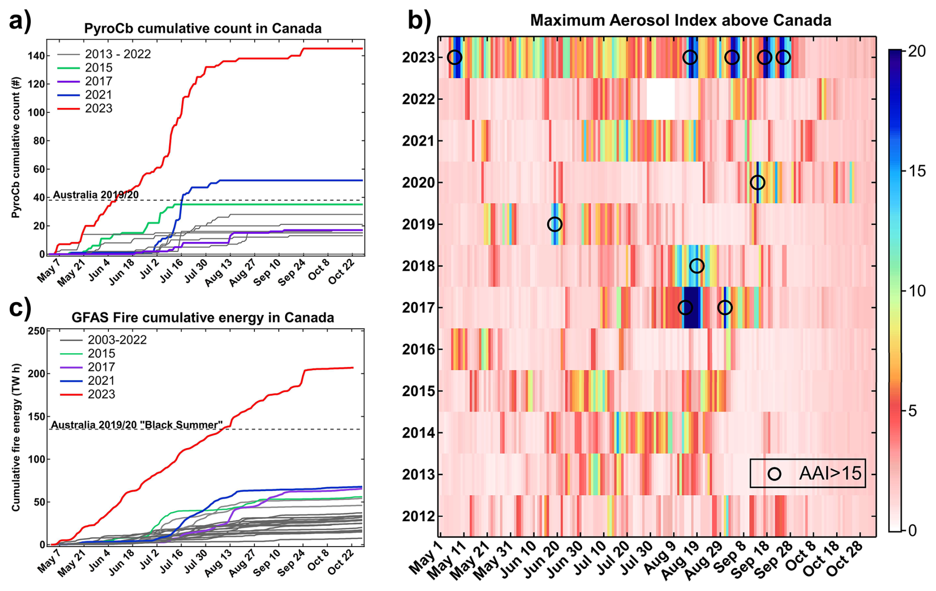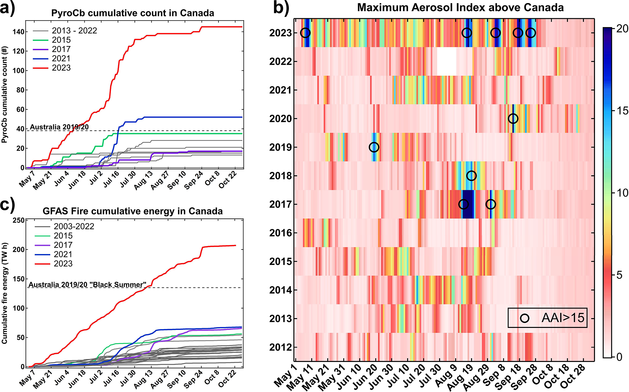 Figure 1General metrics of the 2023 Canadian wildfires in perspective. (a) Cumulative energy (in TWh) released by wildfires Canada from May through October for different years since 2003 from GFAS data. (b) Cumulative number of PyroCb events in Canada since 2013. (c) Seasonal variation (May through October) of the maximum Absorbing Aerosol Index (AAImax) over Canada from OMPS-NM observations since 2012. Black circles mark the events with AAImax > 15 associated with stratospheric injection of smoke.