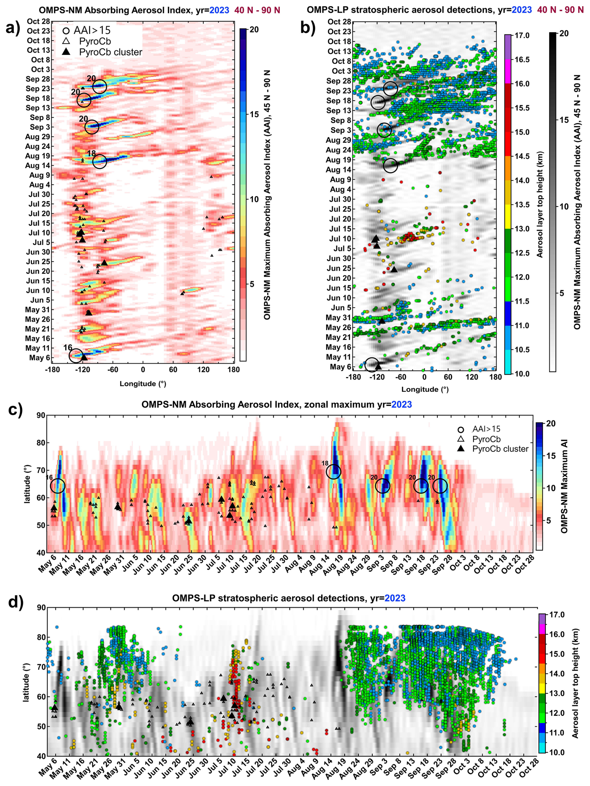 Figure 2Spatiotemporal evolution of smoke plumes during the 2023 wildfire season. (a) Longitude-time variation of AAImax within 40–90° N. Black circles mark the events with AAImax > 15. Small open and large filled triangles indicate respectively the individual and cluster PyroCb events. (b) Longitude-time variation of OMPS-LP SALD (Stratospheric Aerosol Layer Detection) within 40–90° N displayed as circles color-coded by the top altitude of aerosol layer. The underlying image shows AAImax (same as b). (c, d) As in (a) and (b) but in latitude-time space with full zonal coverage.