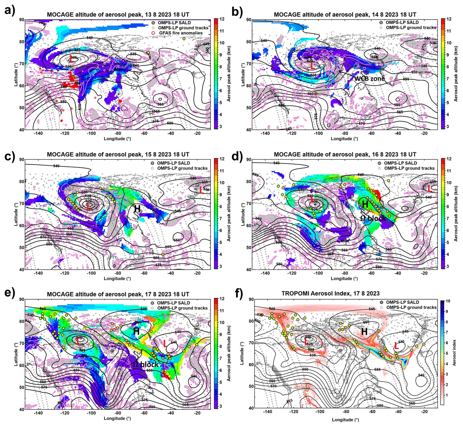 Figure 3WCB-driven smoke uplift episode (event #3) illustrated as sequential geographical maps for the 13–17 August 2023 period. (a–e) Color shading show MOCAGE-simulated altitude of maximum concentration of wildfire aerosols (km); black contours show ERA5 geopotential height at 500 hPa (labels in dam); pink contour with grey shading indicates areas with downward ERA5 500 hPa vertical velocity; open circles mark OMPS-LP ground track locations; color-filled circles indicate OMPS-LP SALD locations (same color map as for MOCAGE altitude). SALD altitude corresponds to the peak of the observed extinction ratio profile. All maps are provided for 18:00 UT, which roughly corresponds to the time of OMPS-LP measurement within the given region. (f) TROPOMI aerosol index on 17 August 2023 with ERA5 500 hPa geopotential and OMPS-LP SALDs.