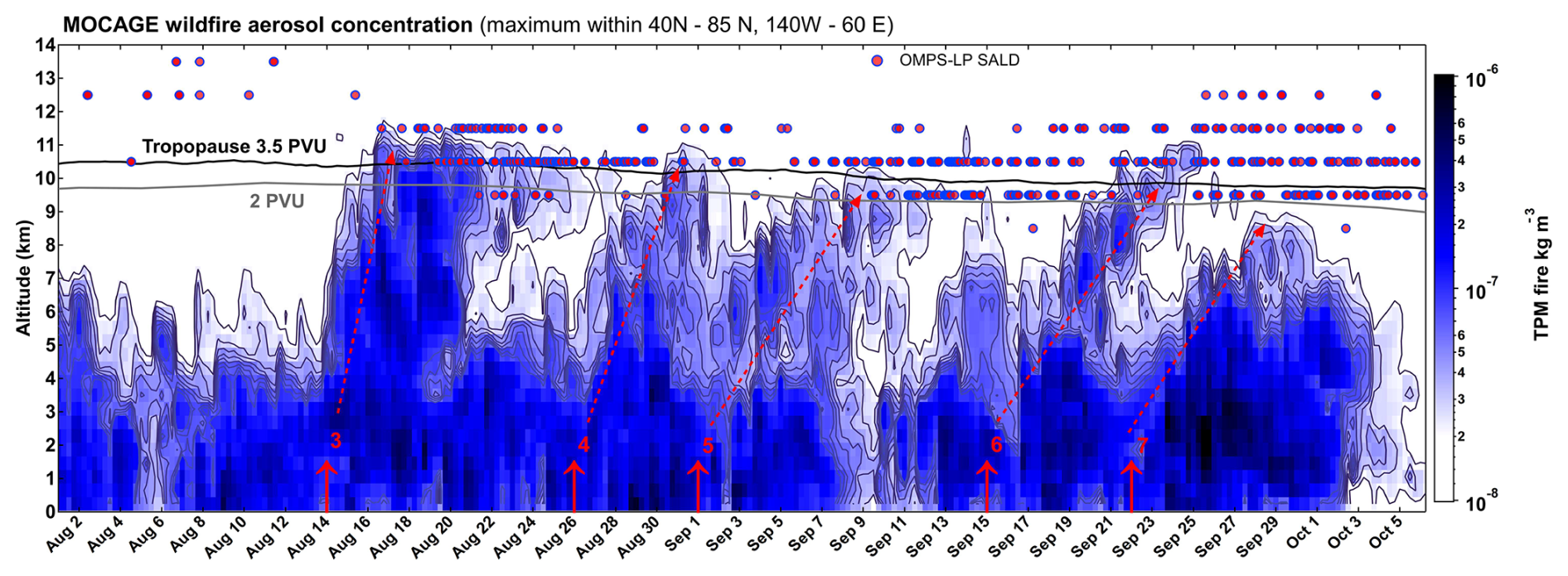 Figure 4 provides a height-resolved time series of the maximum wildfire aerosol concentration from MOCAGE for the primary WCB-affected region, extending from Alaska to Europe. It reveals five successive episodes of smoke injection into the UTLS during August and September that involved the WCB mechanism (see Table 1). The 14 August event analysed in Fig. 3 stands out as the largest uplift of smoke from 4 to 11 km, extending above the dynamical tropopause (i.e., 3.5 PVU). Stratospheric injection is confirmed by satellite observations (OMPS-LP SALDs, red circles in Fig. 4). This event and the next two WCB uplift episodes occurred in the absence of pyroCb activity in Canada, which diminished substantially during the 9 August–13 September period.