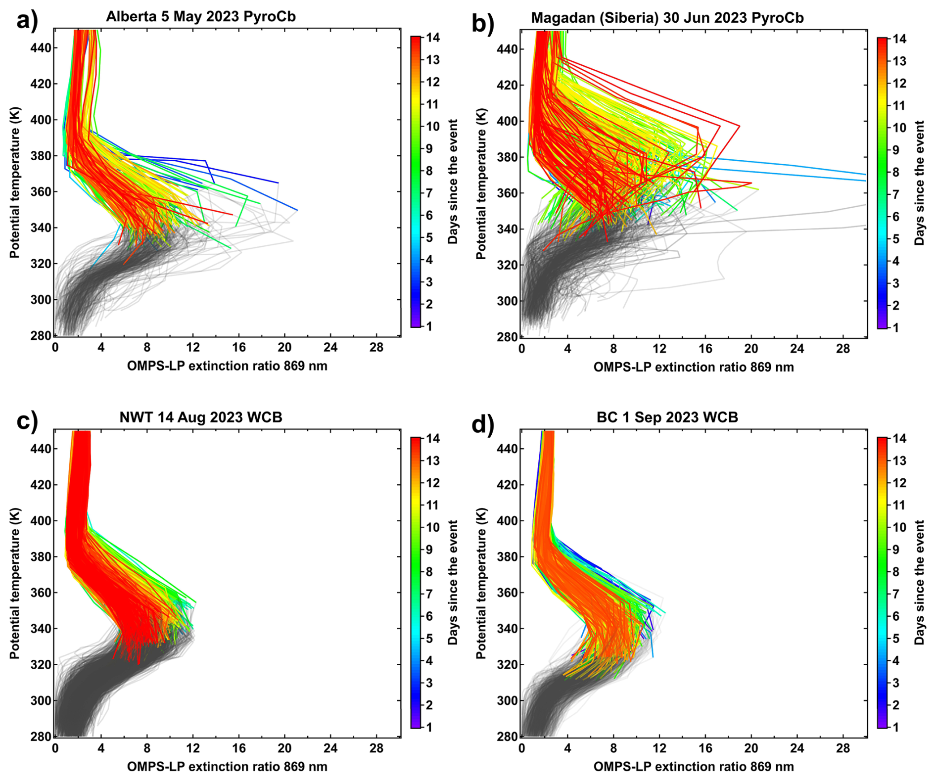 The question that arises is whether the mechanism and timescale of the smoke uplift can affect the habits of the stratospheric plumes. Figure 5 compares the vertical profiles of OMPS-LP Extinction Ratio (ER, ratio between aerosol and molecular extinction) within the pyroCb- and WCB-generated aerosol plumes over the course of two weeks following the respective event. The pyroCb plumes from a cluster pyroCb event on 5 May in Alberta (Fig. 5a) as well as from a twin pyroCb event on 30 June in Eastern Siberia (Fig. 5b) can be characterized by a strong variability of the peak ER value and its potential temperature level over time. In contrast, the WCB plumes from two uplift episodes in August and September (Fig. 5c, d) do not show significant variability either in the peak ER values or in their vertical structure.