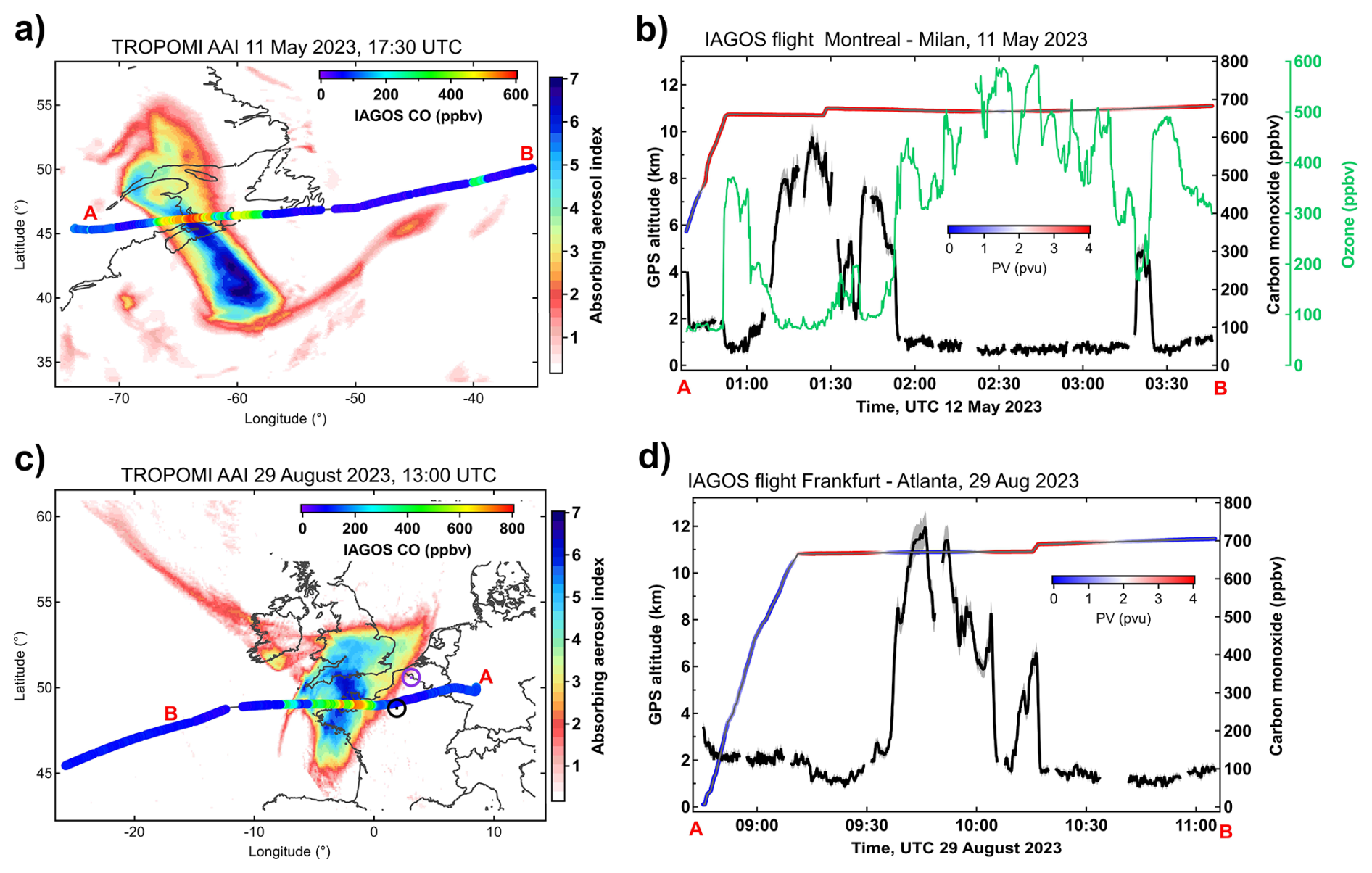 Figure 6Satellite and airborne observations of Canadian smoke plumes. (a) TROPOMI Absorbing Aerosol Index (AAI) on 11 May 2023, showing smoke plume from the 5 May cluster PyroCb event in Alberta, and IAGOS flight segment A to B color-coded by CO mixing ratio. (b) Time series of flight altitude (color coded by potential vorticity), CO and O3 mixing ratio measured during the A to B IAGOS flight segment. (c) As in (a) but for 29 August 2023 (WCB uplift episode from 26 August). LILAS lidar location is indicated as violet circle. Radiosonding station location near Paris is shown as black circle. (d) As in (b) but for the flight in 29 August. Ozone was not measured in this flight.