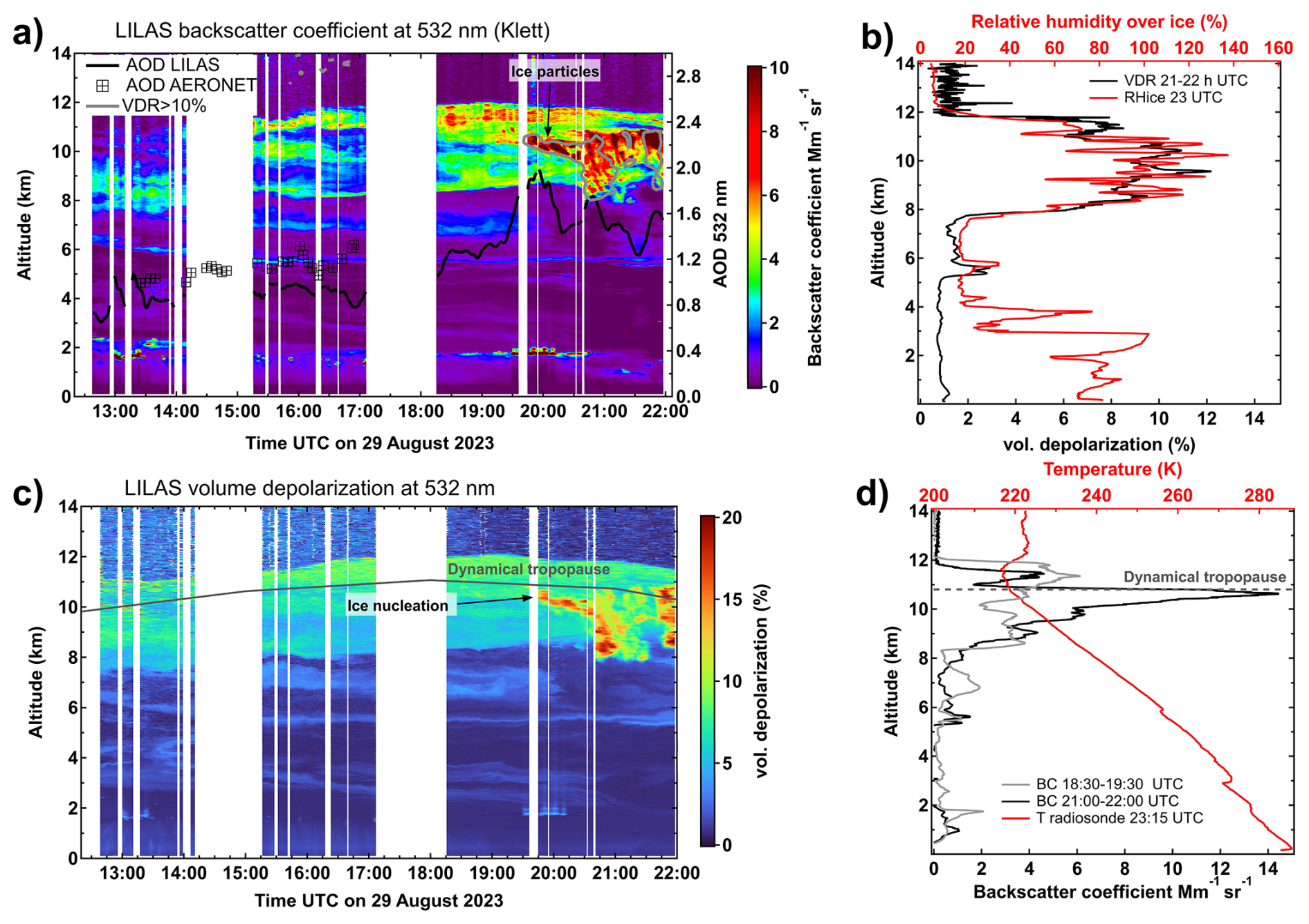 Figure 7 displays lidar time curtains of backscatter coefficient (Fig. 7a) and volume depolarization ratio (VDR) (Fig. 7c) acquired during the time of plume's transit over the lidar station. The lidar curtains reveal multiple smoke layers throughout the free troposphere with the primary layer extending between 8 and 12 km i.e., across the dynamical tropopause (10.9 km, Fig. 6c), which is aligned with the first thermal tropopause (Fig. 7b). The cloud-free aerosol optical depth (AOD) at 532 nm, computed from lidar extinction below 12 km, varies between 0.9 and 1.2 during the time period 15:15–19:30 UTC. This is in close agreement with the collocated AERONET (AEROsol RObotic NETwork) sun photometer reporting the columnar AOD between 1.1–1.3. The small difference between AOD measured by LILAS and sun photometer result from incomplete overlap of the lidar system. Due to this issue, extinction coefficient from LILAS was assumed to be constant below 800 m, which may lead to underestimation of AOD. The lidar-derived AOD of the primary smoke layer itself amounts to approximately 1 at 19:00 UTC. For comparison, the highest AOD value within a smoke layer observed over Europe after the PNE wildfire outbreak in August 2017 amounted to 0.6 (Ansmann et al., 2018).