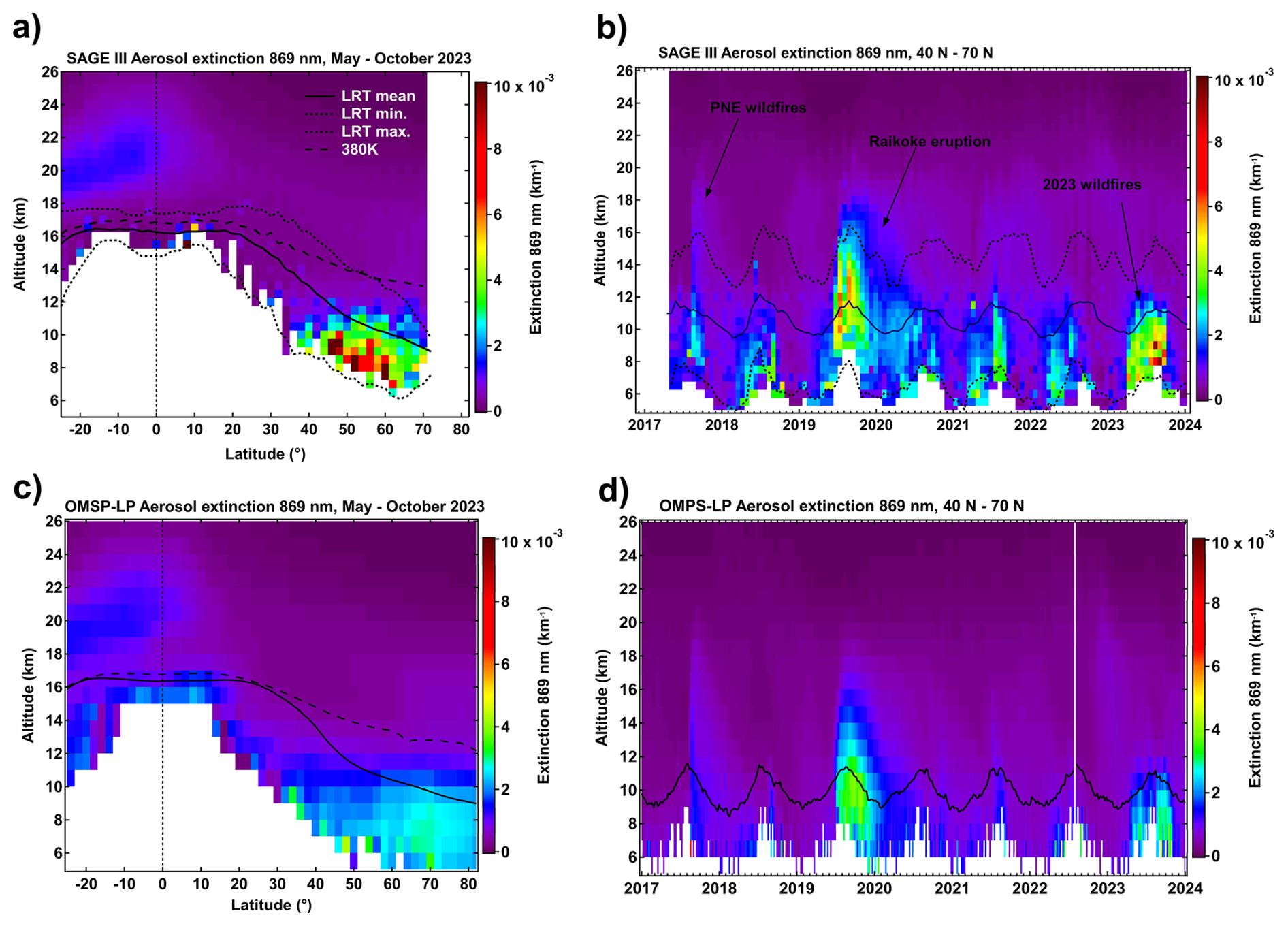 The Stratospheric Aerosol and Gas Experiment (SAGE) III provides stratospheric aerosol extinction coefficient profiles using solar occultation observations from the International Space Station (ISS) (Cisewski et al., 2014). These measurements, available since February 2017, are provided for nine wavelength bands from 385 to 1550 nm and have a vertical resolution of ∼ 0.7 km and are characterized by high precision (< 5 %). We use version V5.3 of SAGE III solar occultation aerosol extinction data at 869 nm. Only the data above the local thermal tropopause (derived from MERRA-2 reanalysis) are used for plotting.