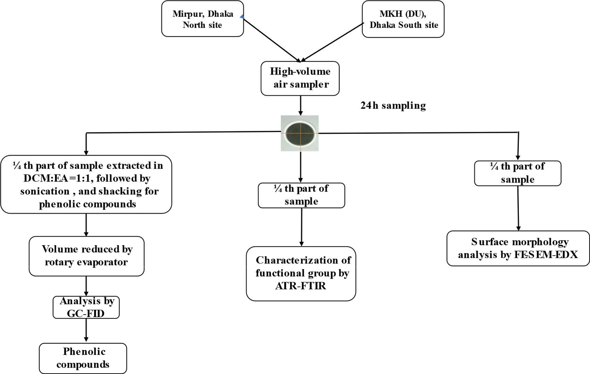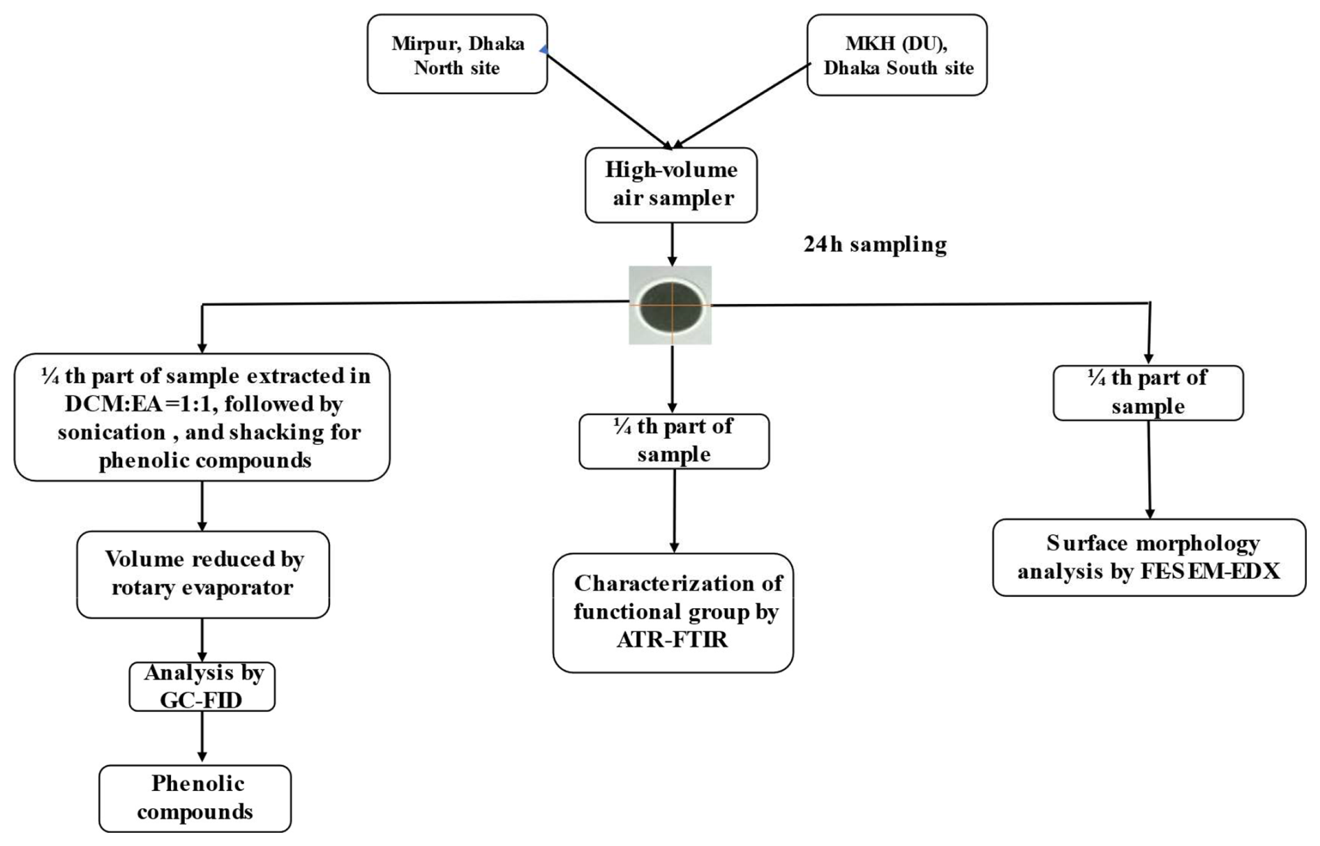 Figure 1 illustrates the sampling and analysis workflow. In short, PM2.5 samples were collected for 24 h from two locations in Dhaka city. Each PM2.5-loaded filter was divided into four equal parts. One-quarter was extracted and analyzed for phenolic precursors of brown carbon using gas chromatography–flame ionization detection (GC-FID). Another quarter was used to identify functional groups via attenuated total reflectance–Fourier transform infrared spectroscopy (ATR-FTIR). A further quarter was examined for surface morphology and elemental composition using field emission scanning electron microscopy coupled with energy-dispersive X-ray spectroscopy (FESEM-EDX).