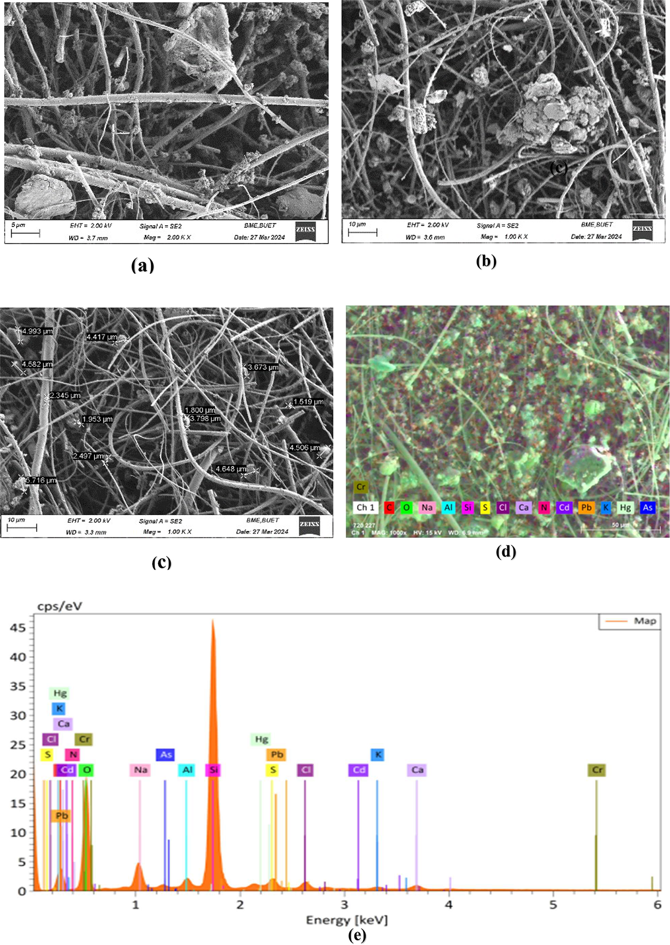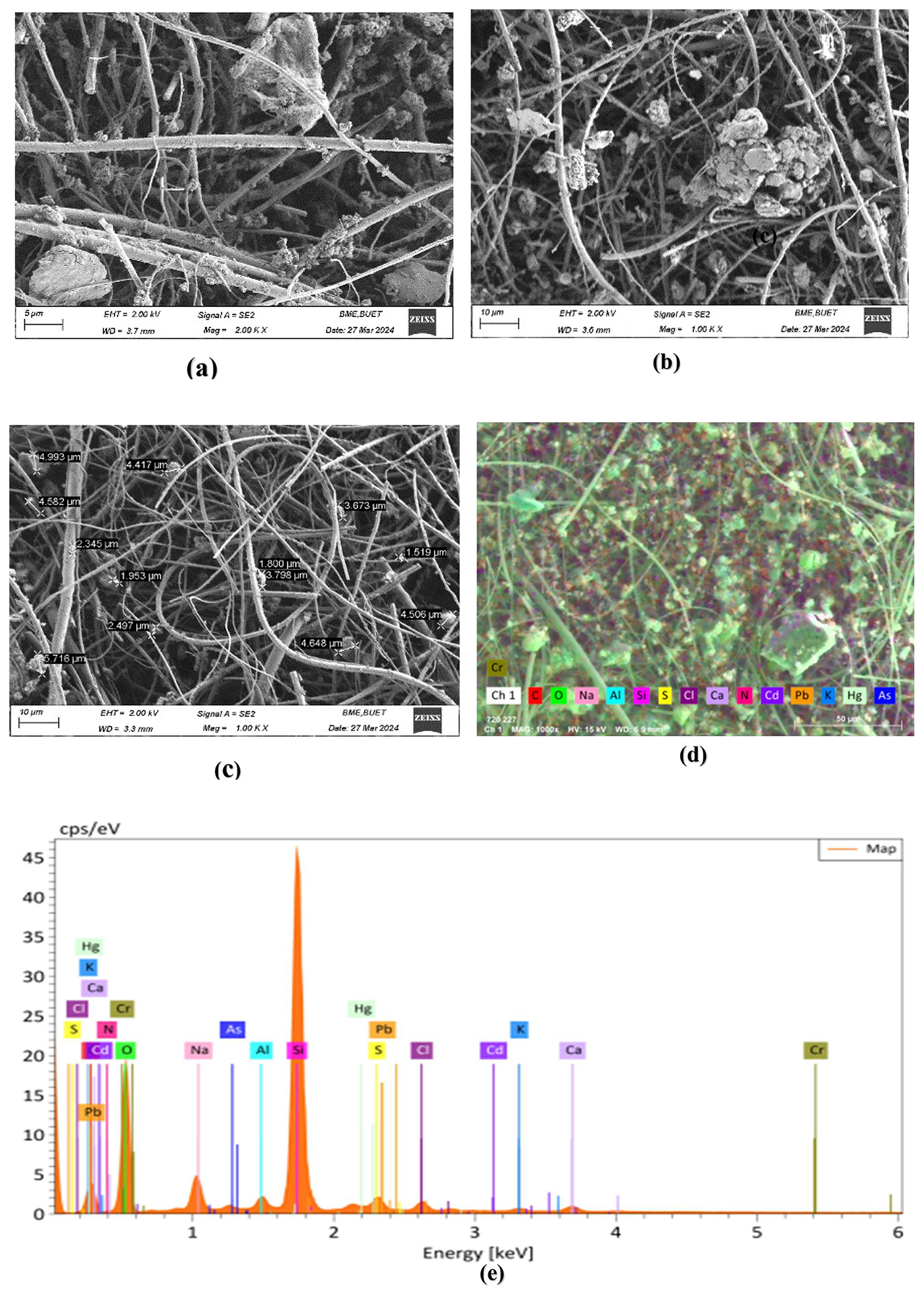 According to the EDX data, surface chemical compositions were categorized into carbonaceous, mineral dust, and trace metal. Table 2 shows that the quantity of carbon (C) and oxygen (O) was very high in PM2.5, along with varying amounts of minerals (Ca, Fe, K, Al), sulfur, nitrogen, and trace metals (As, Cr, Cd, Pb, Hg). The sequence of carbonaceous elements (C, O, N, and S) in Dhaka North & South sites was O > C > N > S.