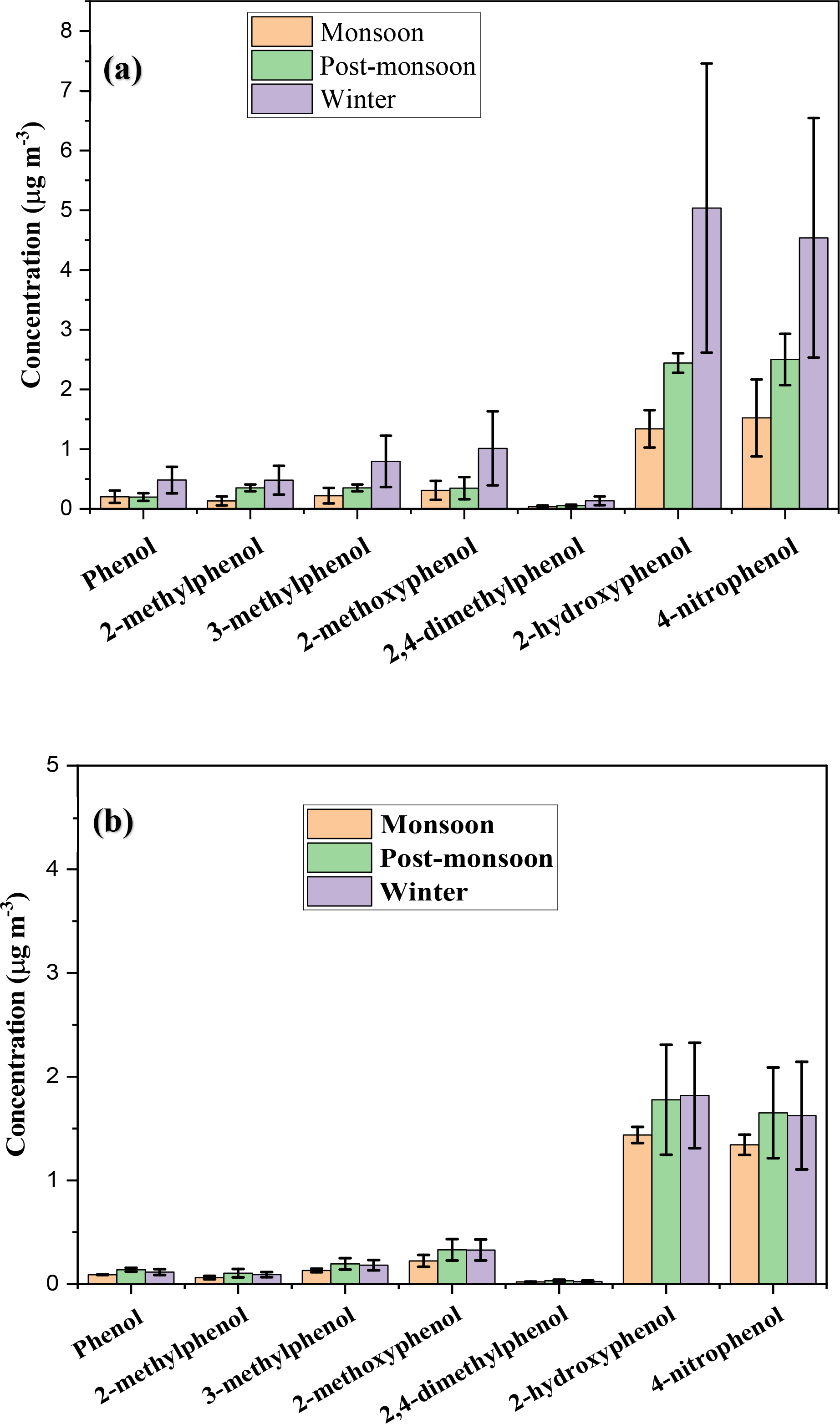 Figure 3Variation of concentration of phenolic compounds in (a) Dhaka, South and (b) Dhaka North site during monsoon, post-monsoon and winter.