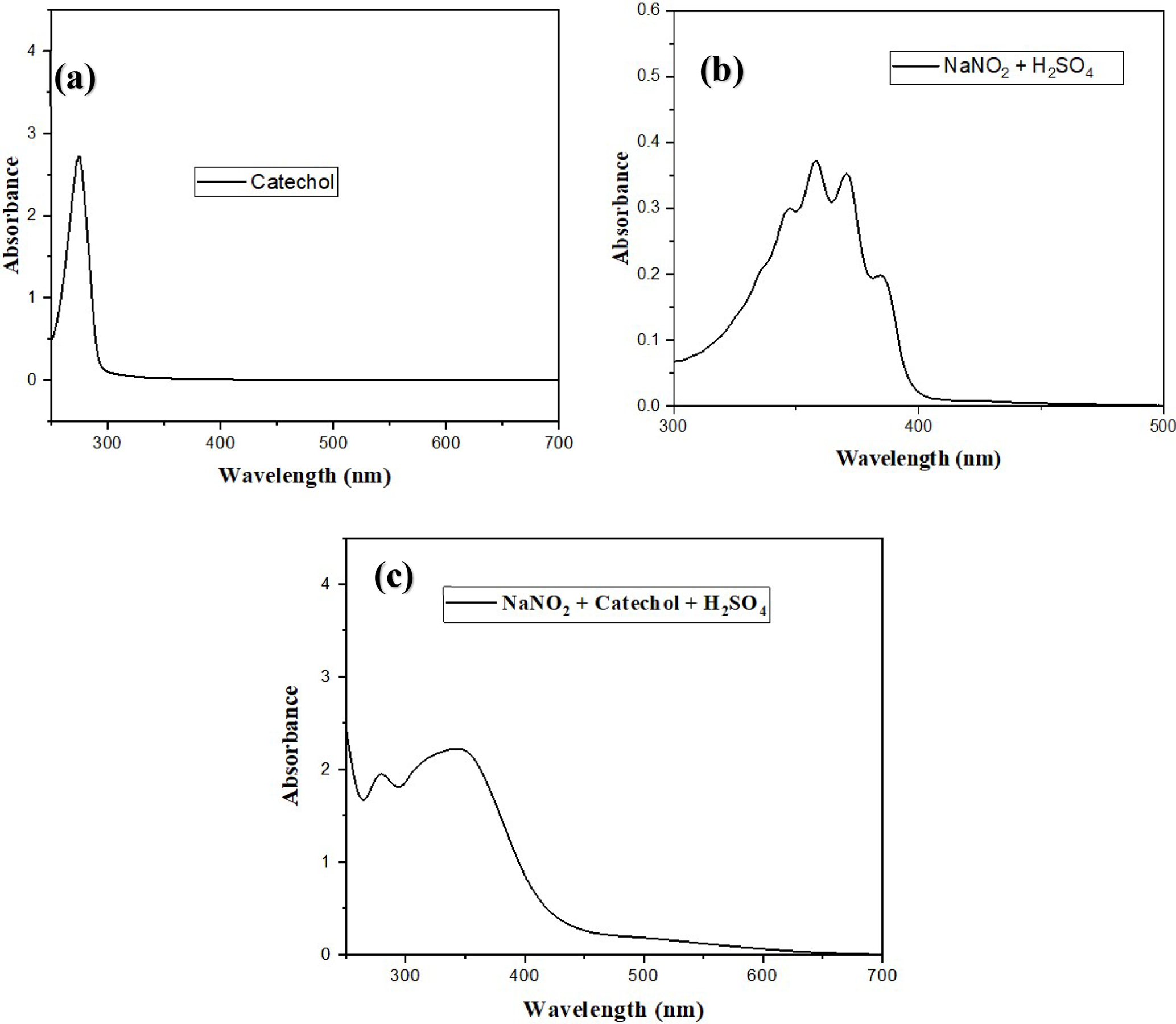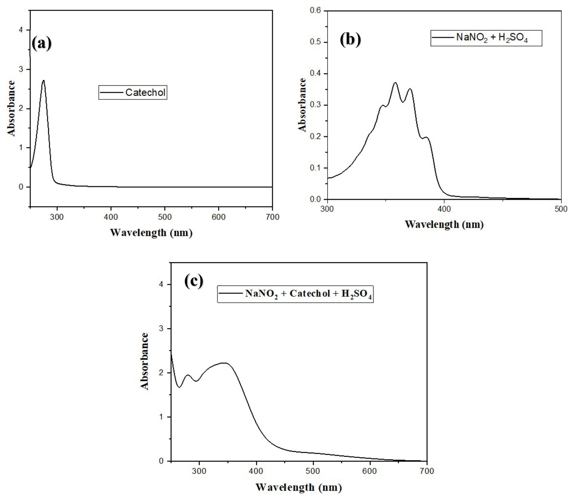 The catechol (2-hydroxyphenol) absorbs the UV-visible light at 280 nm (peak at 280 nm) (Scalzone et al., 2020). When it reacted with the sodium nitrite in the presence of H2SO4, the peak (λmax) was shifted to a longer wavelength. This shift of λmax indicated that there was an interaction between 2-hydroxyphenol and the nitrite ions in the reaction system (Fig. 4).