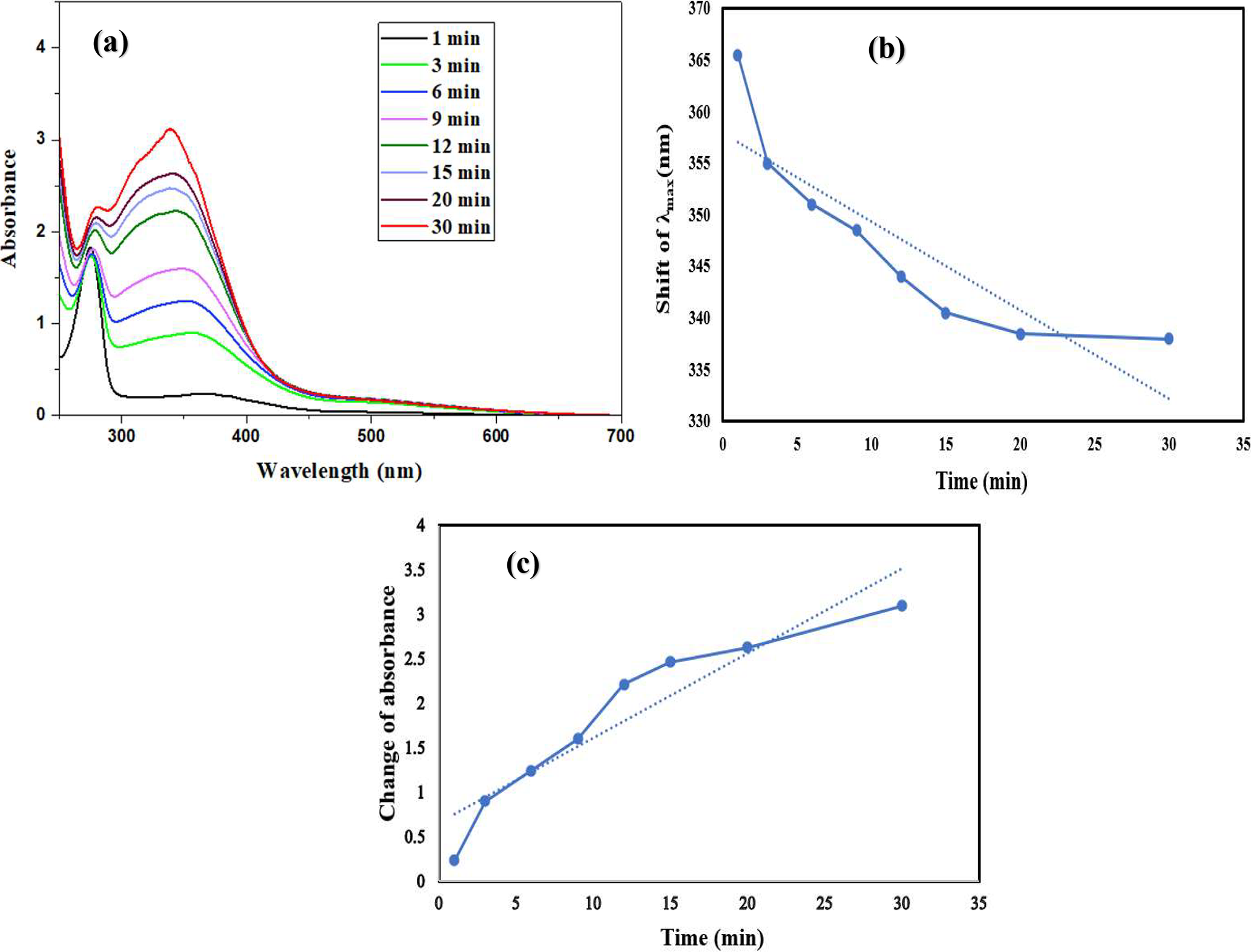 PM At pH =3.5, the absorbance gradually increases with time in the wavelength range from 300–700 nm, and the λmax shifts to a shorter wavelength with time increase. Initially, at 1 min the λmax obtained at 355 nm then as time increased the absorbance increased gradually and the λmax shifted to a shorter wavelength such as 338 nm after half an hour and no change further increase in time (Fig. 5a). It is clear from this change that the nitro group has been added to the aromatic ring, leading to an increase in absorption and a shift in the position of the peak.