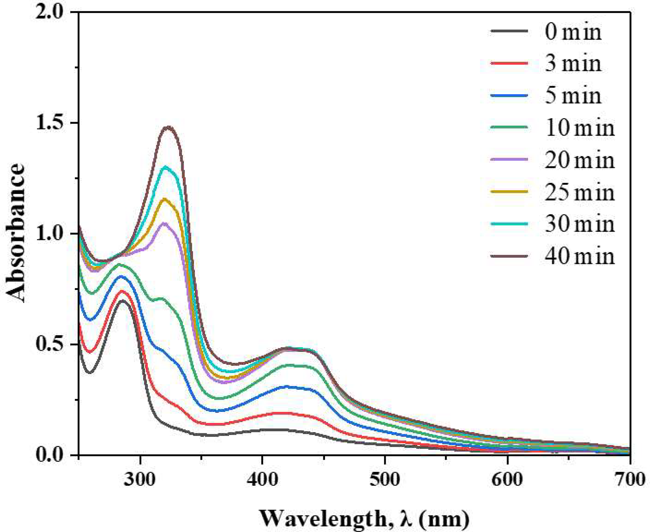 Figure 6UV-visible absorption spectra of the nitrite-catechol reaction system in alkaline medium, pH ∼7–8 to form a light-absorbing nitro aromatic compound.