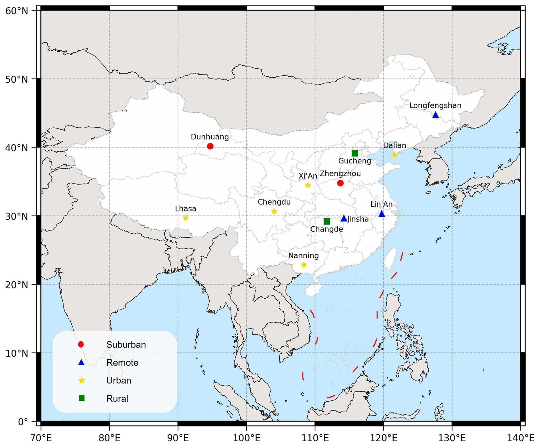 The annual mean PM10 concentrations for urban, rural, suburban, and remote sites were , , , and , respectively. These data show that urban-rural transition zones had the highest PM10 concentrations, which may be due to the simultaneous influence of multiple pollution sources from both urban and rural areas, including industrial emissions, traffic pollution, and agricultural activities (Li et al., 2014). In contrast, remote sites had the lowest PM10 concentrations, reflecting minimal anthropogenic influence in these regions, with primary pollution sources consisting of natural dust resuspension and long-range transported pollutants (Jiao et al., 2021).