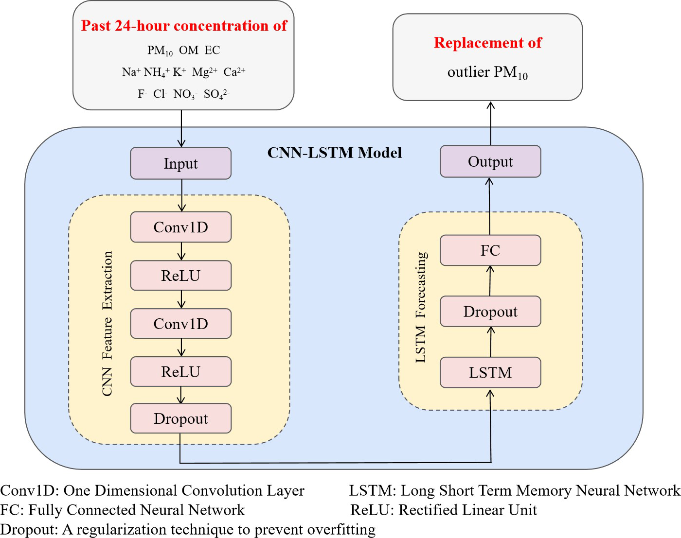 Several studies have shown that CNN-LSTM models have excellent performance in PM prediction, with low error rates and reduced training times (Li et al., 2020; Huang and Kuo, 2018). In this study, PM10 concentration data were preprocessed for 11 chemical components: OM, EC, Na+, , K+, Ca2+, Mg2+, F−, Cl−, , and . Specifically, if the sum of the chemical components in a data set exceeded the PM10 mass concentration or fell below 50 % of the PM10 mass concentration, the PM10 concentration in that data set was considered anomalous and removed. After screening, the remaining data were retained and included in the training set. A hybrid model combining CNN and LSTM was used to predict PM10 concentrations based on the training set. As shown in Fig.4, The model first extracts local features from the data through two CNN layers: the first CNN layer uses 16 channels and a kernel size of 2, while the second CNN layer uses 32 channels and the same kernel size, capturing local feature patterns through a sliding window with a stride of 1. Each CNN layer is followed by a ReLU activation function to introduce non-linearity, and a Dropout layer with a probability of 0.2 to enhance generalization capability. Subsequently, a 2-layer LSTM network (with 64 hidden units) captures long-term dependencies in the time series, with the LSTM layers also applying the same Dropout mechanism; finally, the prediction results are output through a fully connected layer. During the training process, Mean Squared Error (MSE) was used as the loss function, and the Adam optimizer was employed for parameter optimization, with an initial learning rate set to 0.0005. When training the model, a total of 3000 training epochs were set, while dynamically monitoring the loss value, with early stopping when the loss value fell below a preset threshold of 0.0007. Upon completion of training, the model was evaluated on both training and test sets by calculating MAE, RMSE, and Coefficient of Determination (R2) to comprehensively evaluate the predictive performance of the model.