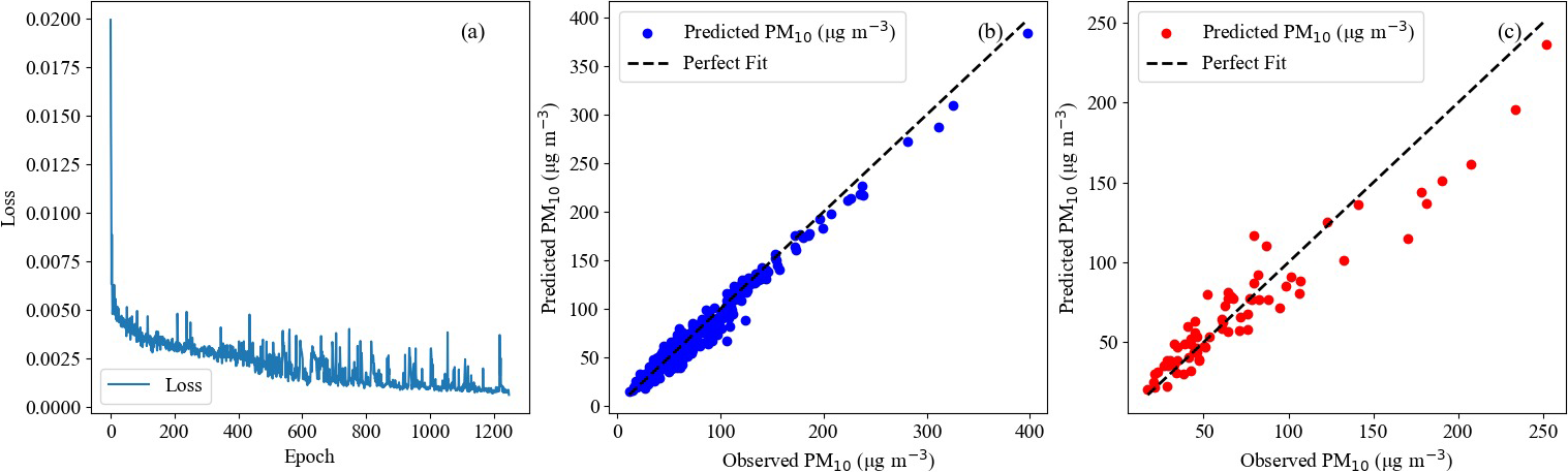 The model was evaluated on both the training and test sets after completion of training, with results presented in Table 2 and Fig. 5. As shown in Fig. 5a, the training process converged effectively, with the loss function decreasing steadily and stabilizing at approximately 0.0007, indicating successful model optimization without overfitting. For the training set, the CNN-LSTM model achieved a MAE of 6.6614 µg m−3, a RMSE of 8.7162 µg m−3, and a R2 of 0.9670. When evaluated on the test set, the model demonstrated an MAE of 12.6705 µg m−3, a RMSE of 17.4965 µg m−3, and an R2 of 0.8840.