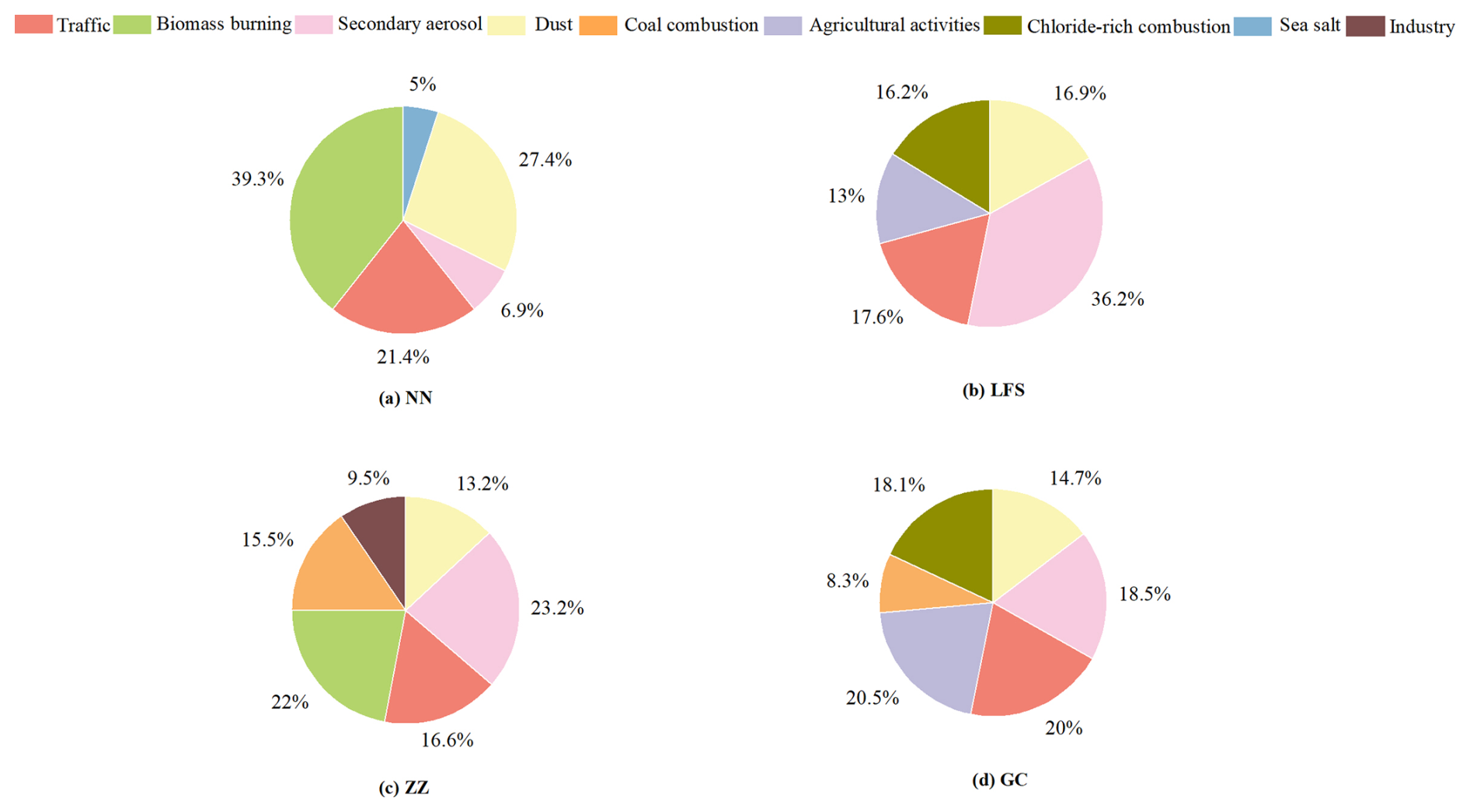 Figure 9The contributions of Traffic, Biomass burning, Secondary aerosol, Dust, Coal combustion, Agricultural activities, Chloride-rich combustion, Sea salt, and Industry to the atmospheric concentration of PM10 mass (%) as derived by PMF modelling at NN, LFS, ZZ, and GC.