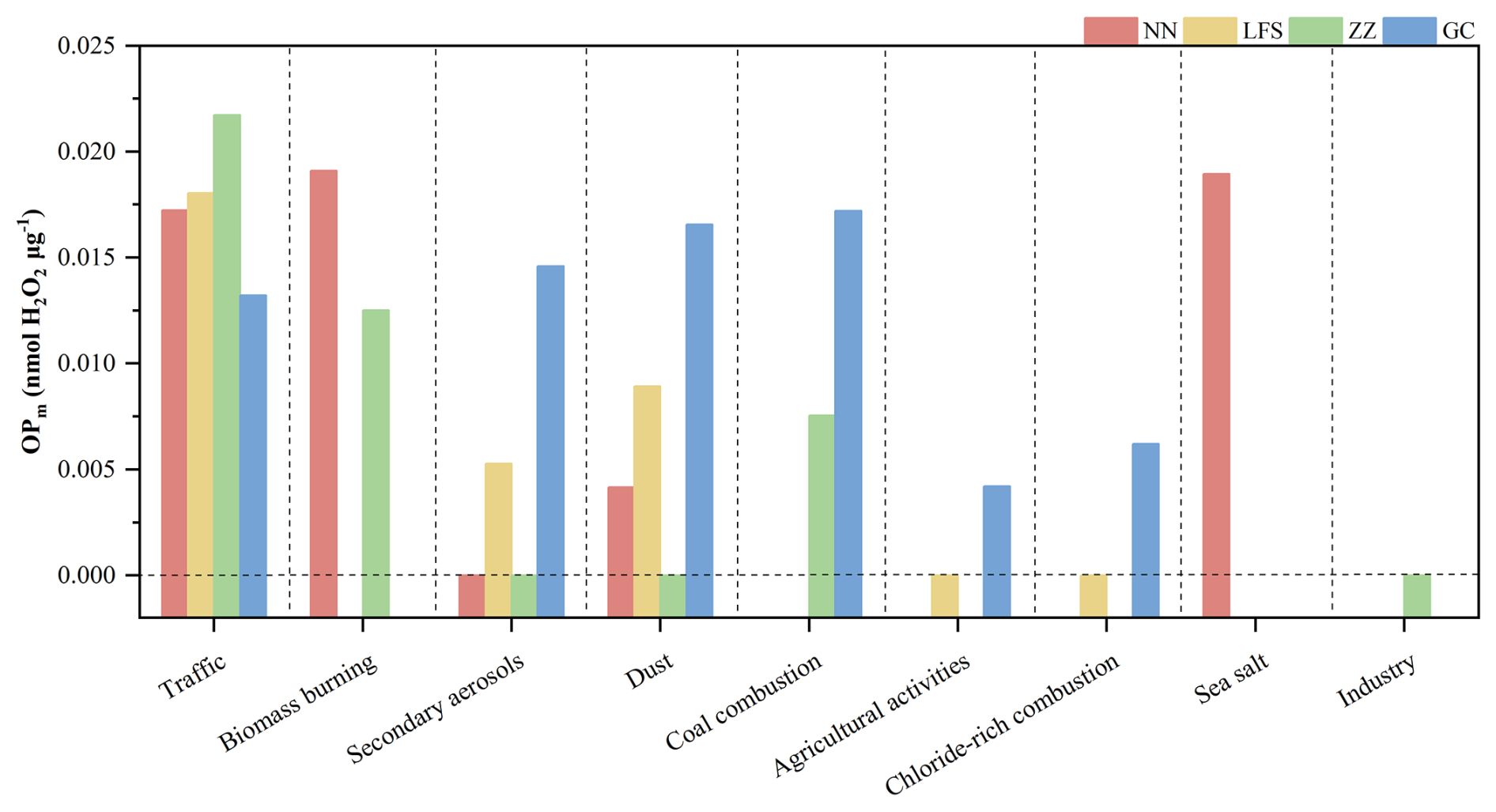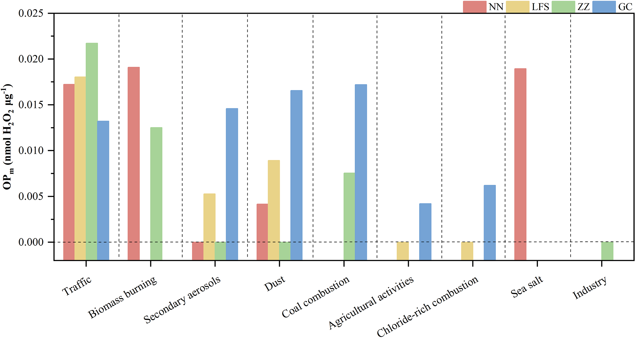 Traffic emission is a common important contributing source to OP at the four sites NN, LFS, ZZ and GC. The high OP of traffic emissions is mainly attributed to the oxidative components in their particulate matter emissions, including organic carbon as well as potentially present PAHs and transition metals (TMs) (Valavanidis et al., 2008). Traffic sources showed high OPm (0.013–0.022 nmol H2O2 µg−1) at all monitoring sites, indicating that the particulate matter they generate has significant toxic efficiency. The high oxidative activity of traffic-emitted particulate matter may be related to its complex chemical composition. PAHs emitted from traffic sources can form quinone compounds and other oxygen-containing organic compounds, which can promote reactive oxygen species generation through redox reactions (Nielsen, 1996; Libalova et al., 2018).