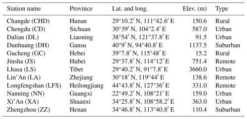 The central Chinese sites of Jinsha (JS), Changde (CHD), and Lin'An (LA) showed relatively lower annual mean concentrations of PM10 which are 47.17, 46.59, and 48.16 µg m−3, respectively. Despite these lower concentrations, the chemical composition shows distinct regional characteristics. Ca2+ concentrations of 2.48 and 2.19 µg m−3 in JS and LA, respectively, likely reflect contributions from soil dust resuspension (Shen et al., 2016). K+ concentration of 0.44 µg m−3 observed in CHD may be related to agricultural activities in the region (Liu et al., 2016).