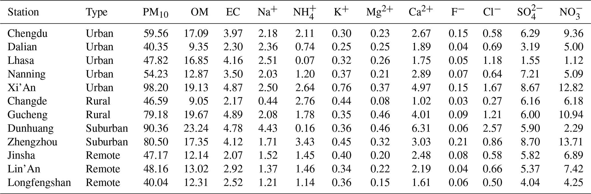 Table 4Annual average concentrations (µg m−3) of PM10 and its chemical composition in different regions of China from June 2022 to May 2023.