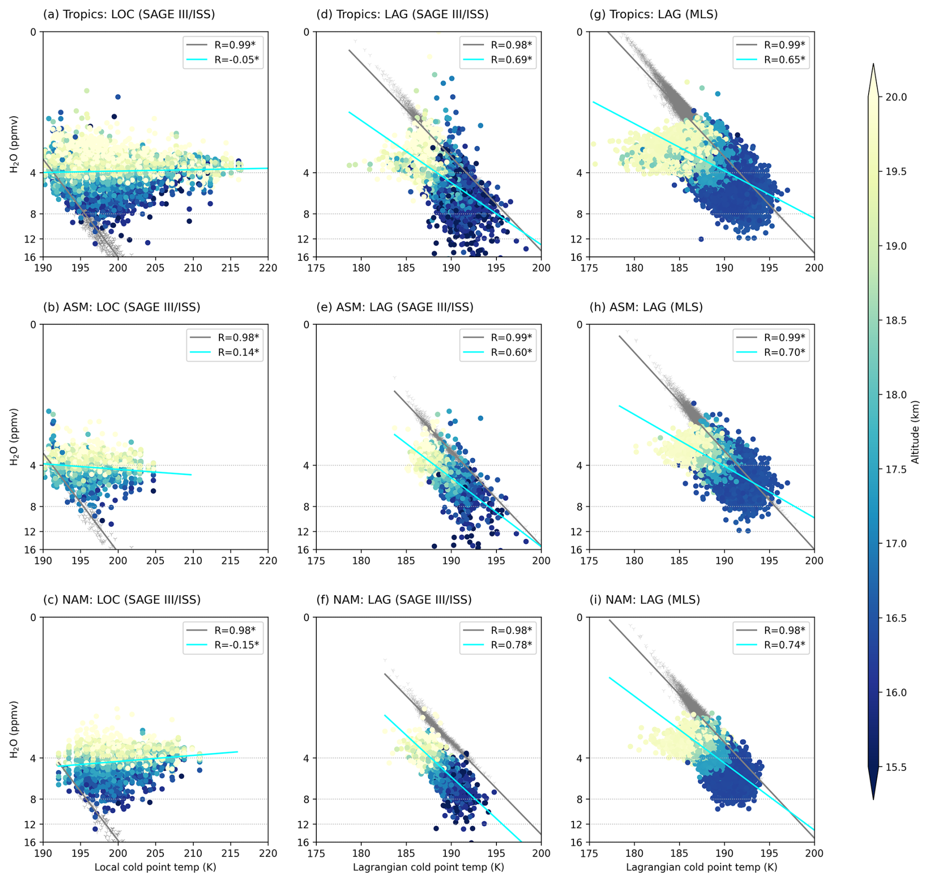 Figure 4Scatter plots of water vapor (H2O) mixing ratios (TST-only) versus cold point temperatures. Left: water vapor observations (SAGE III/ISS) water vapor versus local cold point temperatures (experiment LOC). Middle: water vapor observations (SAGE III/ISS) versus Lagrangian cold point temperatures (experiment LAG based on SAGE III/ISS). Right: water vapor observations (MLS) versus Lagrangian cold point temperatures (experiment LAG based on MLS). Colored points denote water vapor observations, with color indicating altitude. Grey dots represent reconstructed saturation mixing ratios. Legends give the correlation coefficients, with stars marking statistical significance at the 95 % confidence level (Student's t-test).