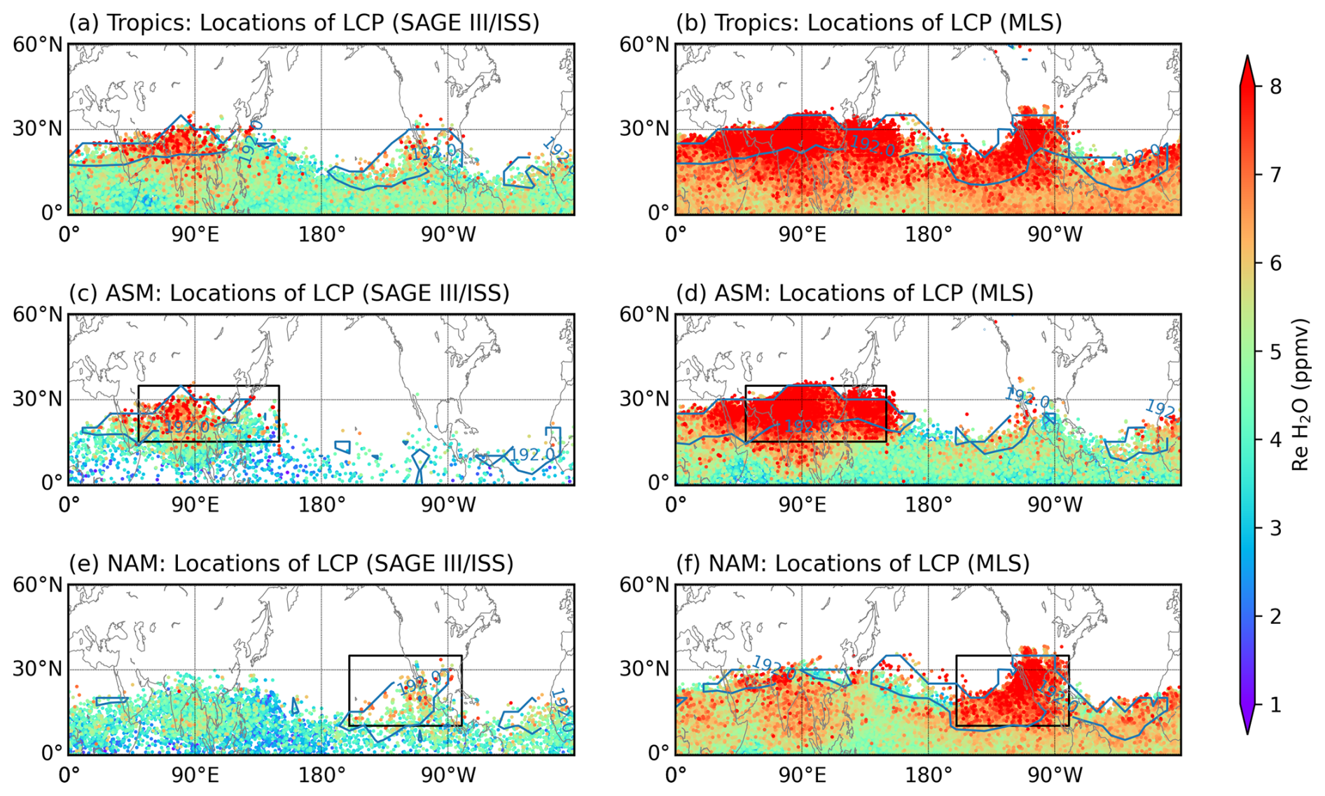 Figure 5Horizontal distributions of Lagrangian cold point (LCP) locations used for water vapor reconstruction at 16.5 km, derived from experiment LAG (TST-only). Colors denote the reconstructed water vapor mixing ratios (Re H2O) at the LCPs, with backward trajectories launched in the tropics (a, b), ASM (c, d), and NAM (e, f). Scatter points are plotted in ascending order of reconstructed values. Blue contours mark the 192 K cold point temperature. Left panels (a, c, e) show results based on SAGE III/ISS, and right panels (b, d, f) show results based on MLS. Black boxes indicate the regions where the backward trajectories are launched.