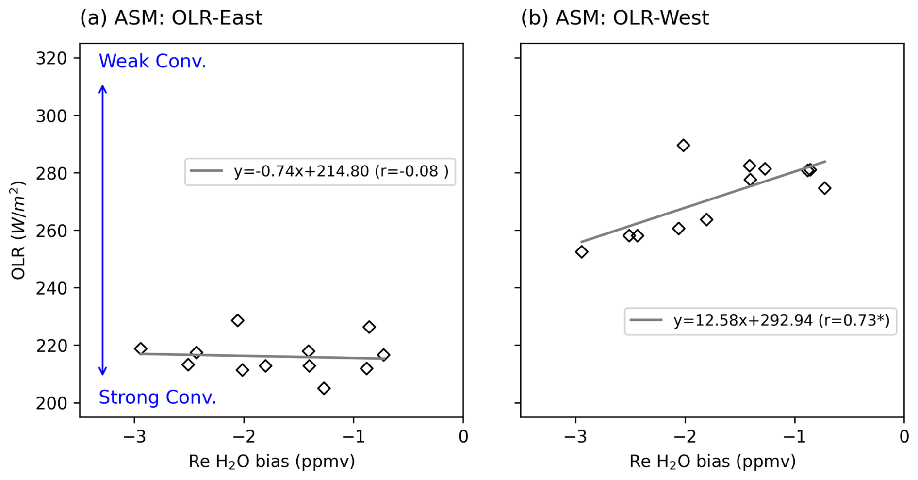 Figure 8Scatter plots of OLR (convection intensity) versus biases in reconstructed water vapor (H2O) mixing ratios (SAGE III/ISS) at 16.5 km for the ASM. Panels (a) and (b) show results using OLR-East and OLR-West, respectively. Biases are half-monthly averages, while OLR values are first averaged over the 0–10 d preceding each date and then half-monthly averaged. Legends show the regression line equations and correlation coefficients, with a star indicating statistical significance at the 95 % confidence level based on the Student's t-test.