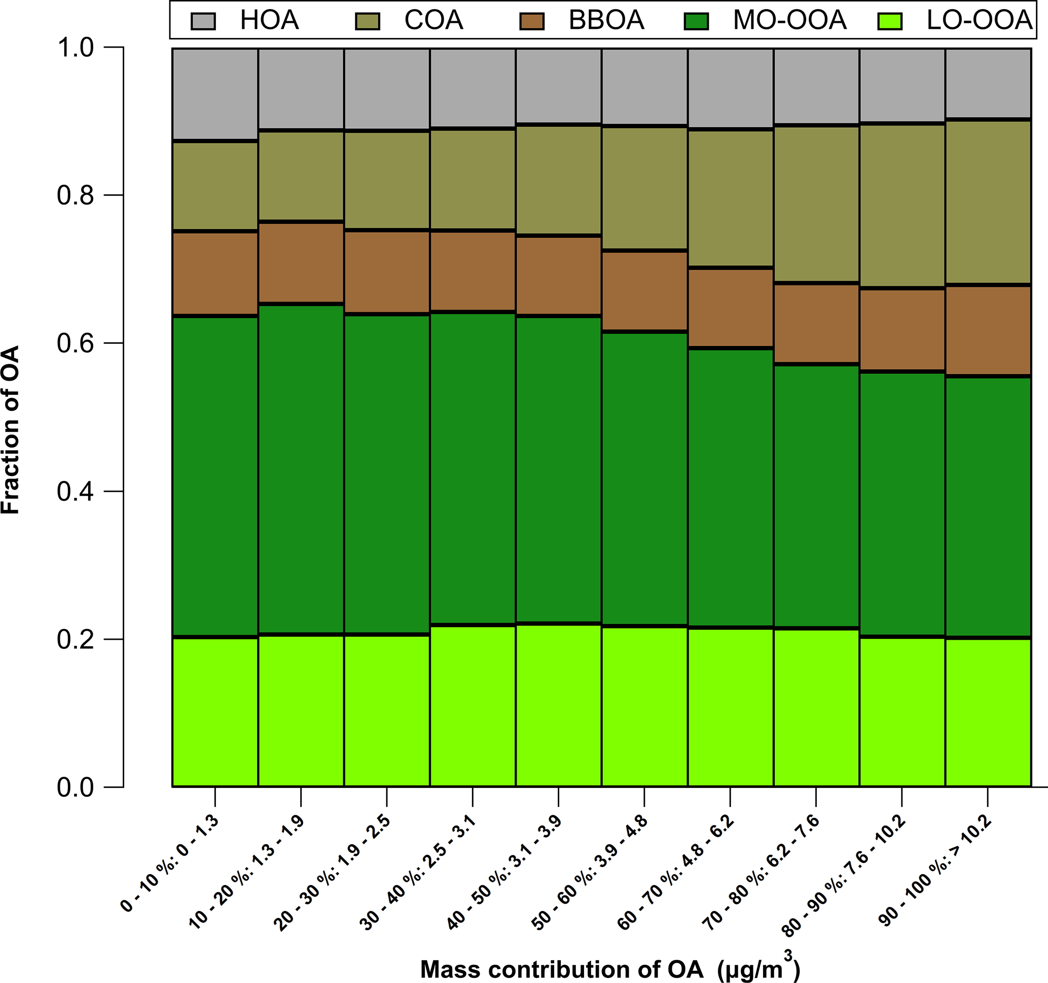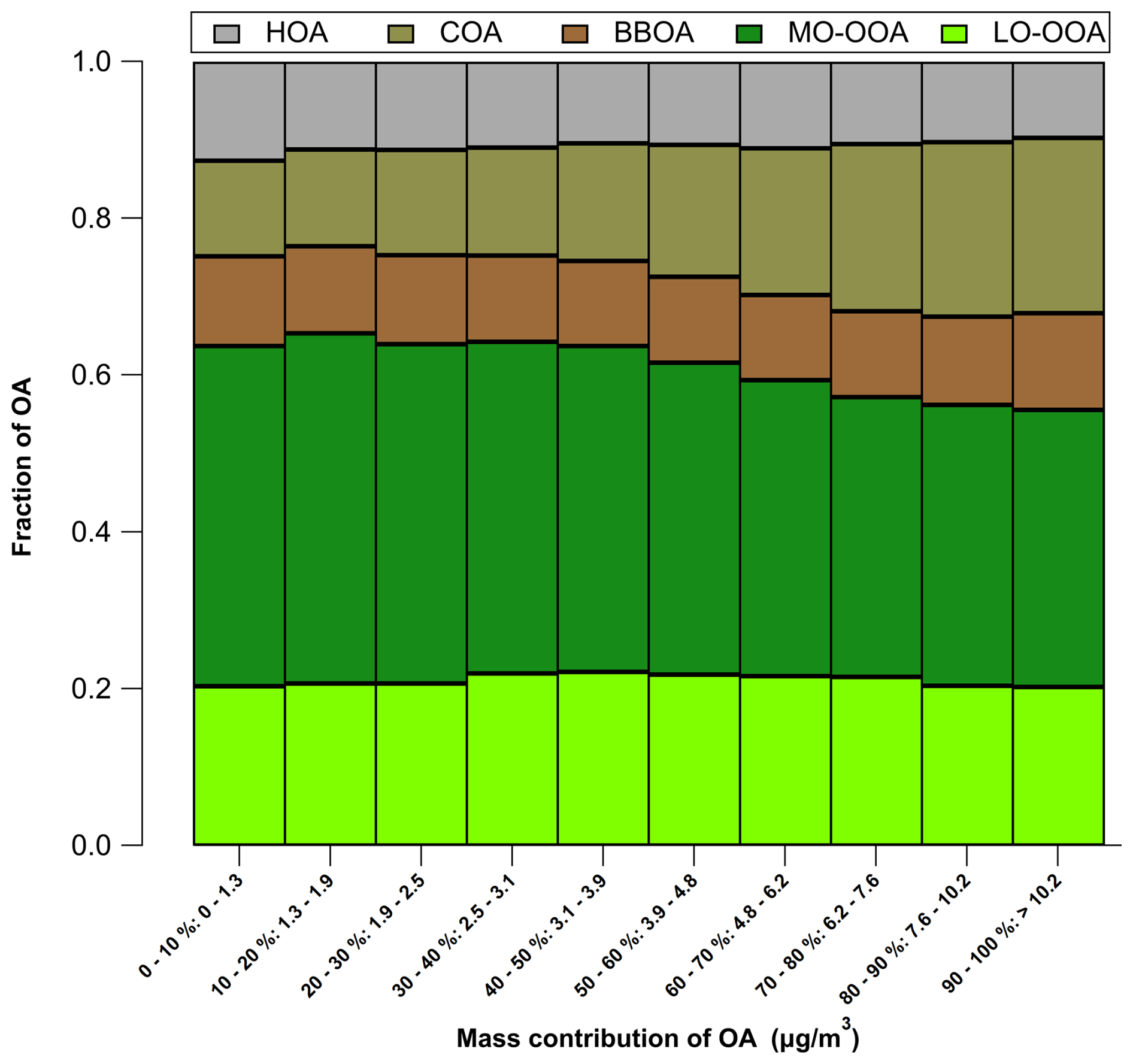 Figure 2Contributions to total OA from the different identified OA sources at different OA concentrations. Total OA concentrations were split in 10 equally distributed bins.
