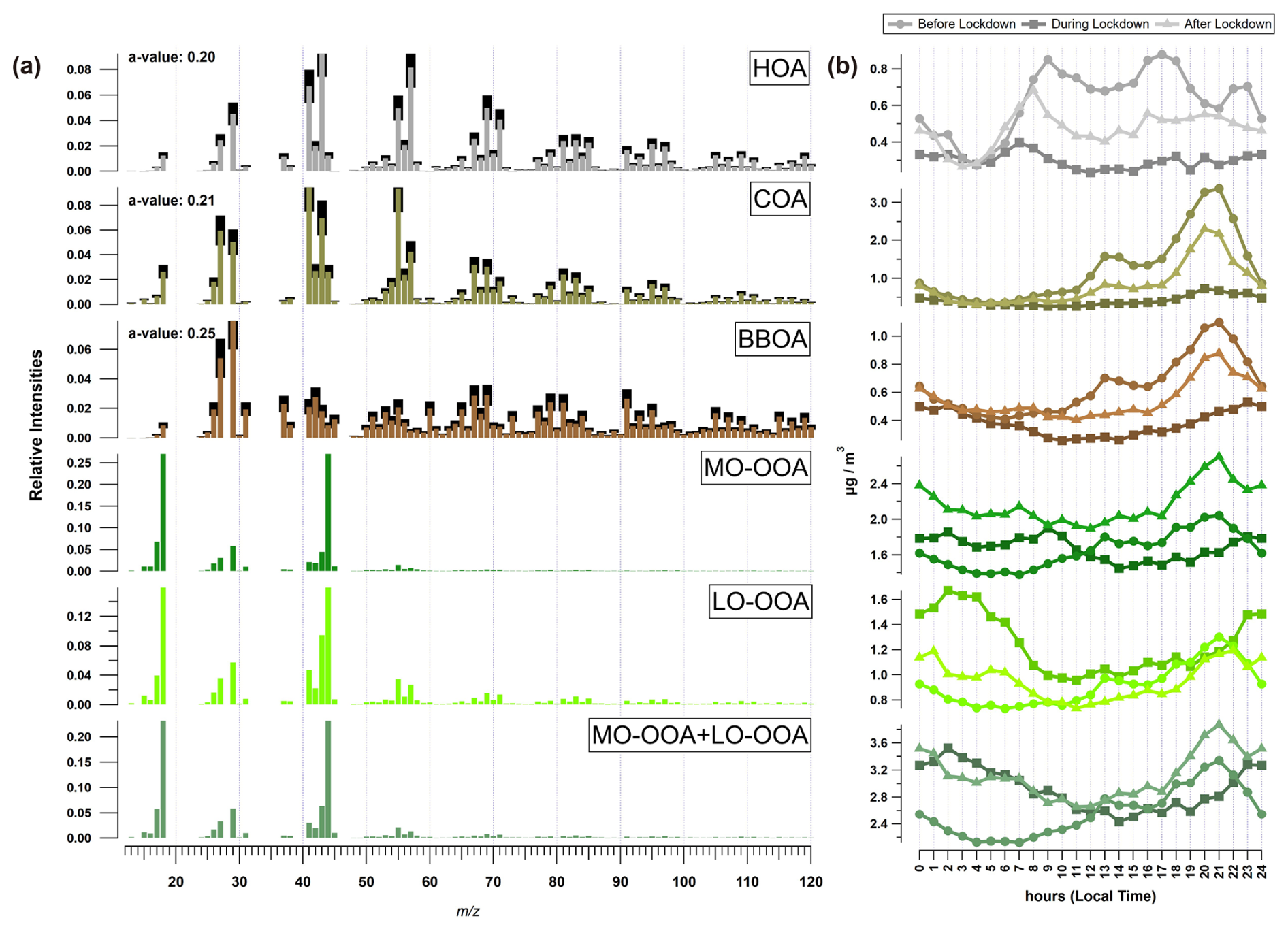 Also, during EOTHO, MO-OOA and LO-OOA increased by 63 % and 70 % respectively compared to post-lockdown concentrations before EOTHO and correlated with increased NH4, NO3 and SO4 concentrations. This was mainly due to long-ranged transported airmasses (Fig. S5) and enhanced photochemistry with increased temperature and mass concentration of POAs (Fig. S4).