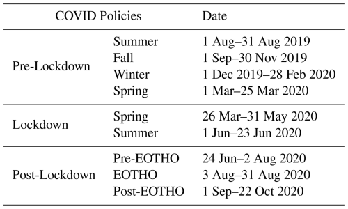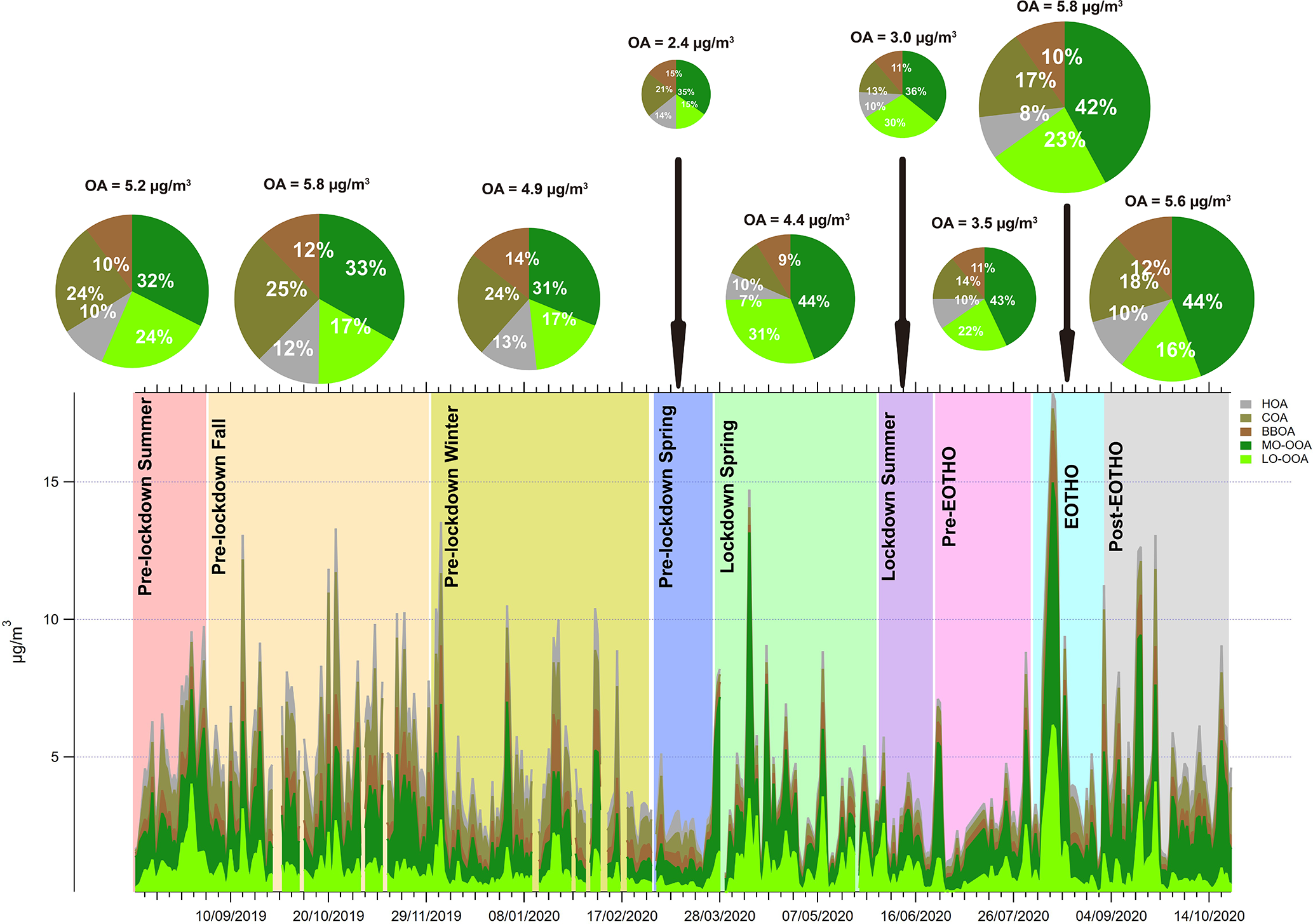 PM1 chemical composition from 1 August 2019 to 22 October 2020, was analysed as this covered the first lockdown period (26 March–23 June 2020) and the EOTHO Scheme (Monday–Wednesday during from 3 August to 31 August 2020, Table 1). In order to isolate the seasonal effects on the PM chemical composition and OA sources from the COVID-related policies, we further split the data based on seasons (Table 1).