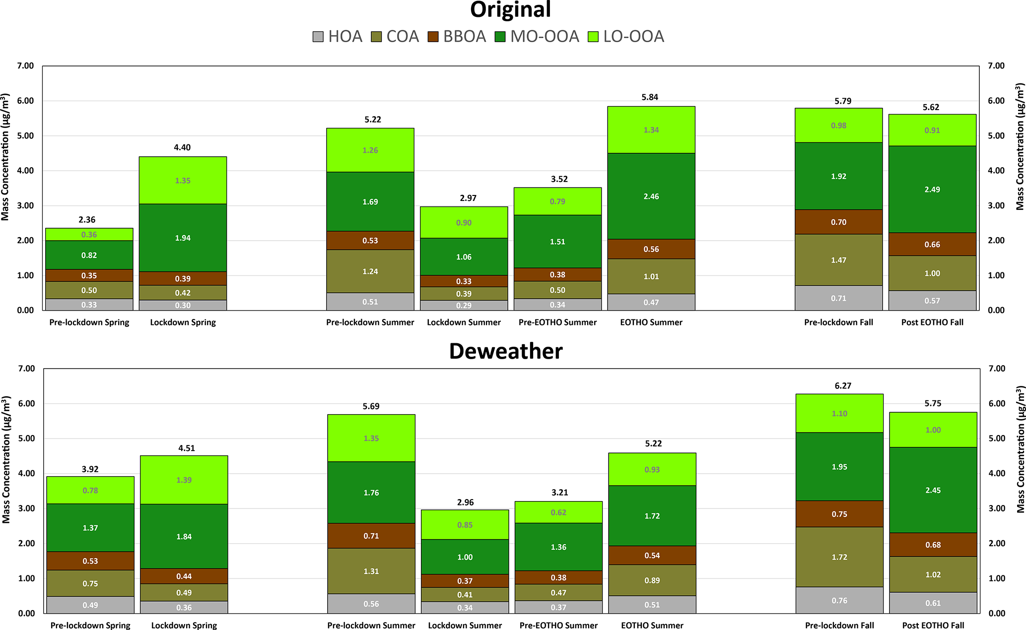 EOTHO policy (3 August–31 August 2020) had a significant impact on all POA factors. In particular, the COA concentration increased by 100 % compared to the post-lockdown period (Pre-EOTHO Summer) from 24 June to 2 August 2020 (0.5 to 1.0 µg m−3, Fig. 6). HOA and BBOA concentrations also increased by 40 % and 48 %, respectively, which suggested the human activities resulting in these emissions recovered slowly after the lockdown (ONS, 2022; Transport for London, 2020). COA was significantly higher due to EOTHO, however, it did not reach pre-COVID concentrations (Figs. 5 and 6) as its level was lower on each weekday except for Monday.