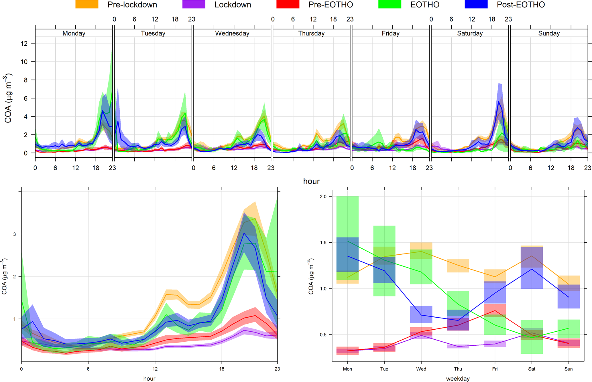 EOTHO only operated from Monday to Wednesday, and this was clear in the diurnal plots (Figs. 6 and S12) with larger COA concentrations from Monday to Wednesday, in contrast to larger concentrations over the weekend (Friday to Sunday) before EOTHO (24 June–2 August 2020). Interestingly, even after the EOTHO policy ceased (1 September–22 October 2020), COA levels remained elevated on Monday and Tuesday but a much higher level during the weekend was observed. This suggests that EOTHO had an influence on the consumer behaviour even after the lockdown. It is also worth noting that the high concentrations of COA and BBOA (Figs. 6 and S11) on Monday night were caused by the last day of EOTHO policy coinciding with a UK public holiday on 31 August.